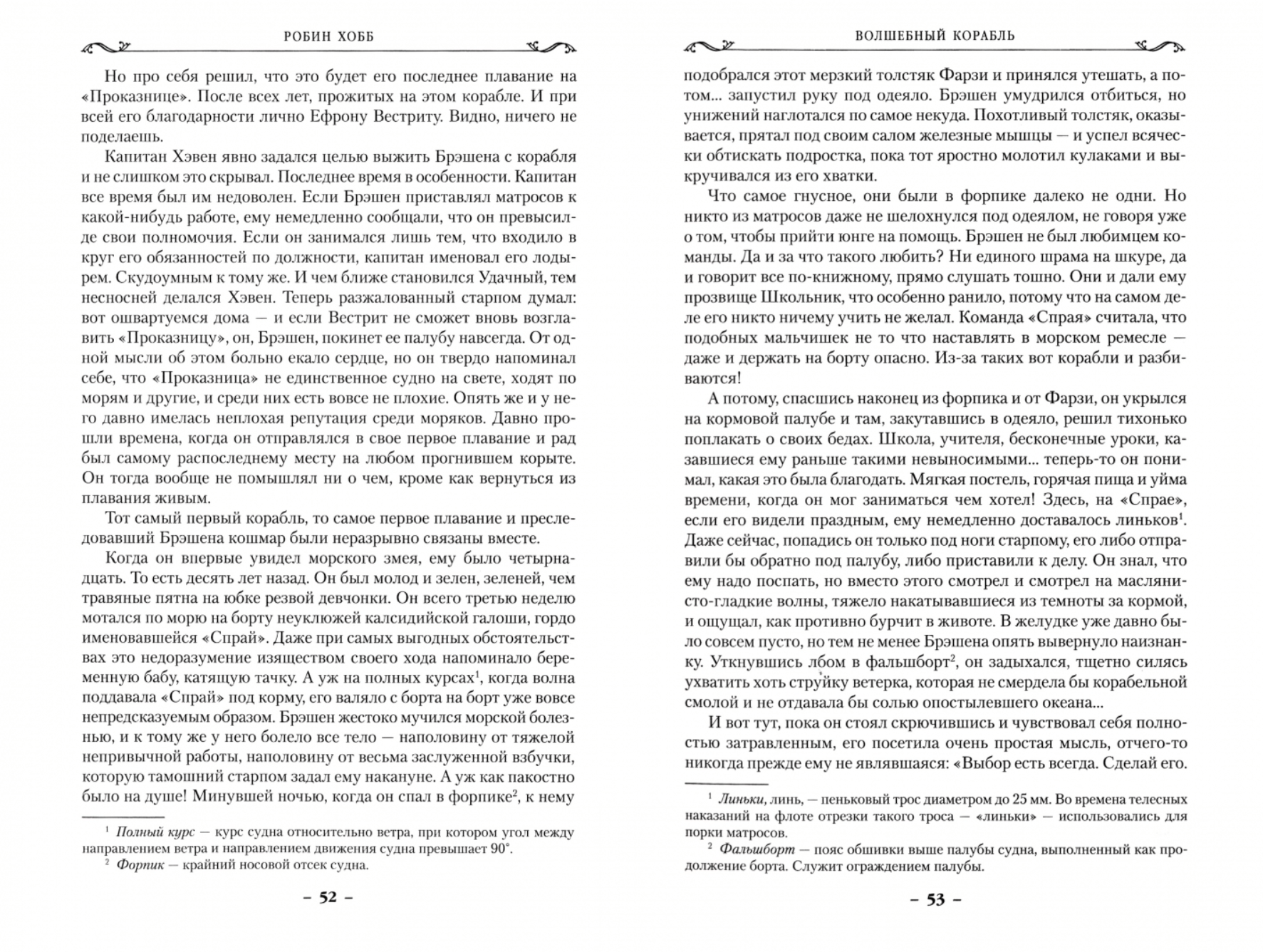 The shores of the warm seas, far to the south of the war-torn Six Duchies, are full of wonders and mysteries. That's why the people here have long been traders. And that's why there are so many pirates in these waters. It's where treasure is mined. The most marvelous and magical ones come from the poisonous Rainforest. And the most precious of the magical treasures is the divode tree, which is used to make living ships. A living ship doesn't just talk - it glides more easily over the waves, it will evade any pursuit, it will tell the helmsman what to do. It's no wonder that for generations, merchant families have been paying off their ship's debt to the thicket dwellers with gold and their offspring. No wonder Altia Westrith would do anything to reclaim the Leper, the ship she's been attached to since childhood. No wonder the successful sea robber Kennit believes that only by capturing a live ship can he become a pirate king. The novel is translated by Maria Semyonova, a master of the art word, author of "Volkodav" and "Valkyrie".