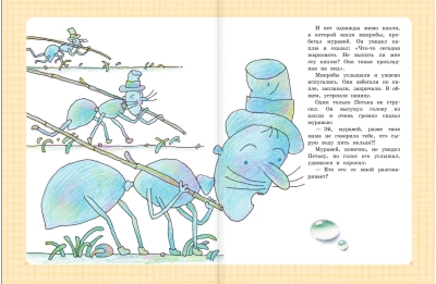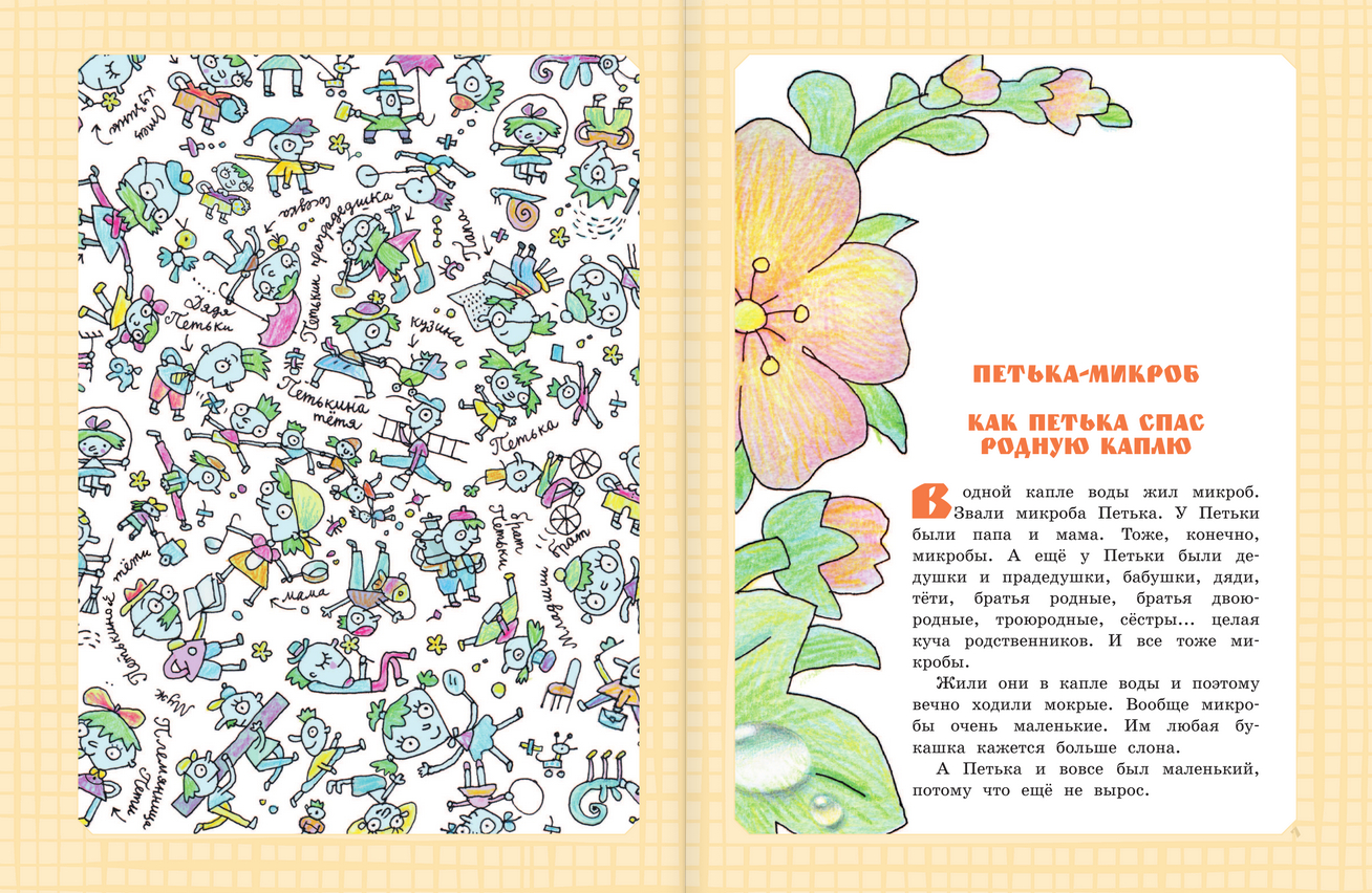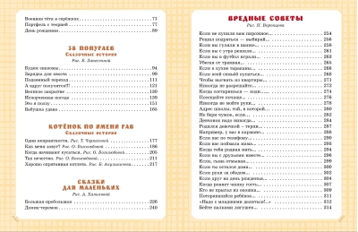 G. Oster's book "The Biggest Book of Fairy Tales, Fairytale Stories, and Harmful Advice" includes some of the author's most famous works: the story "Petka the Microbe" (illustrated by E. Zapesochnaya), tales from the "38 Parrots" series (illustrated by E. Zapesochnaya), which inspired the animated film of the same name, tales from the series about the famous kitten named Gav and his puppy friend (illustrated by B. Akulinichev, O. Bogolyubova, and T. Cherkasova), the tales "Big-Very Big" and "Little House-Teremok" (illustrated by A. Khalilova), as well as the mischievous "Harmful Advice" series, stories from the books "Children and These" and stories from the "Legends and Myths of Lavrovy Lane" series with illustrations by N. Vorontsov.