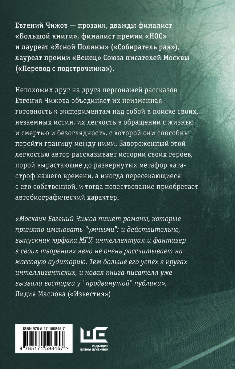 The characters of Yevgeny Chizhov's stories, who are different from each other, are united by their unchanging readiness to experiment on themselves in search of their own, unearned truths, their ease in dealing with life and death, and the recklessness with which they are able to cross the border between them. Mesmerized by this ease, the author tells the stories of his characters, sometimes growing into extended metaphors for the catastrophes of our time, and sometimes intersecting with his own, and then the narrative takes on an autobiographical character. "Muscovite Evgeny Chizhov writes novels that are commonly referred to as "smart": and indeed, a graduate of the Moscow State University Law School, intellectual and fantasist in his creations clearly does not really count on a mass audience. The more his success in the circles of intellectuals, and the new book of the writer has already caused delight among the "advanced" public." Lidia Maslova (Izvestia)