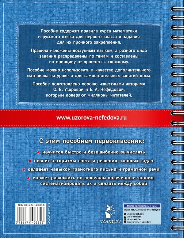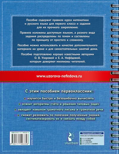 The book includes material on all the main topics of the school course of mathematics and Russian language for the 1st grade. The book contains rules and tasks for their firm consolidation. The material is organized by topic and arranged on the principle from simple to complex. For successful learning it is important to know the rules well, but it is even more important to be able to apply them. The purpose of the manual is to "put everything on the shelves", i.e. to systematize the acquired knowledge and work out the subject skills of the child on various types of tasks. The child will learn to calculate quickly and without errors, master algorithms for solving typical problems, master the skill of literate writing and literate speech. The manual can be used as supplementary material in class and for independent study at home.