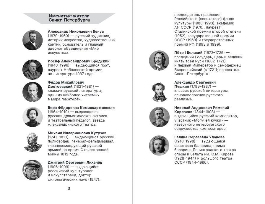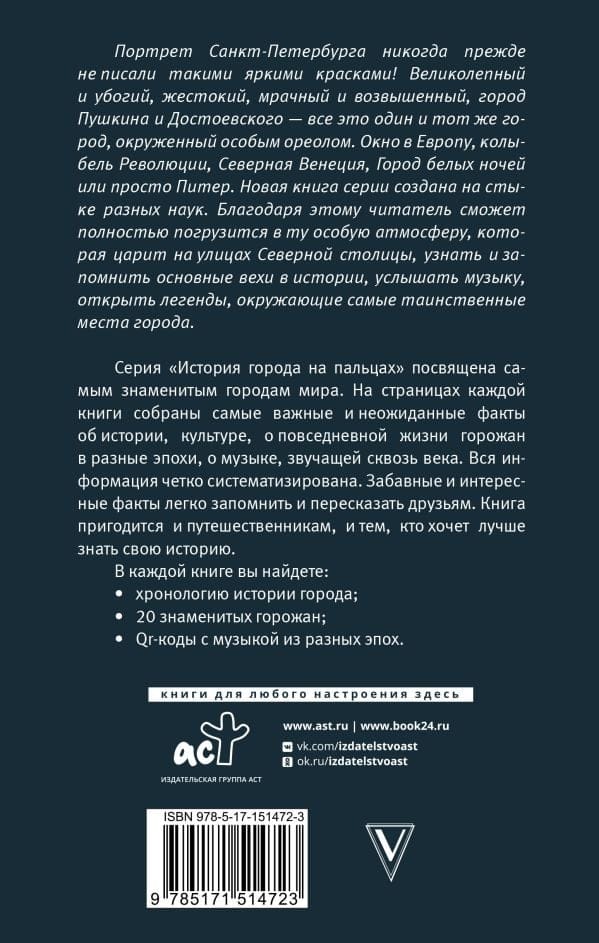 The portrait of St. Petersburg has never before been painted in such vivid colors! Magnificent and squalid, cruel, gloomy and sublime, the city of Pushkin and Dostoevsky - all these are the same city surrounded by a special halo. Window to Europe, the cradle of the Revolution, the Northern Venice, the City of White Nights or simply Peter. The new book of the series is created at the intersection of different sciences. Thanks to this, the reader will be able to fully immerse himself in the special atmosphere that reigns in the streets of the Northern Capital, learn and remember the main milestones in history, hear the music, discover the legends surrounding the most mysterious places of the city.
