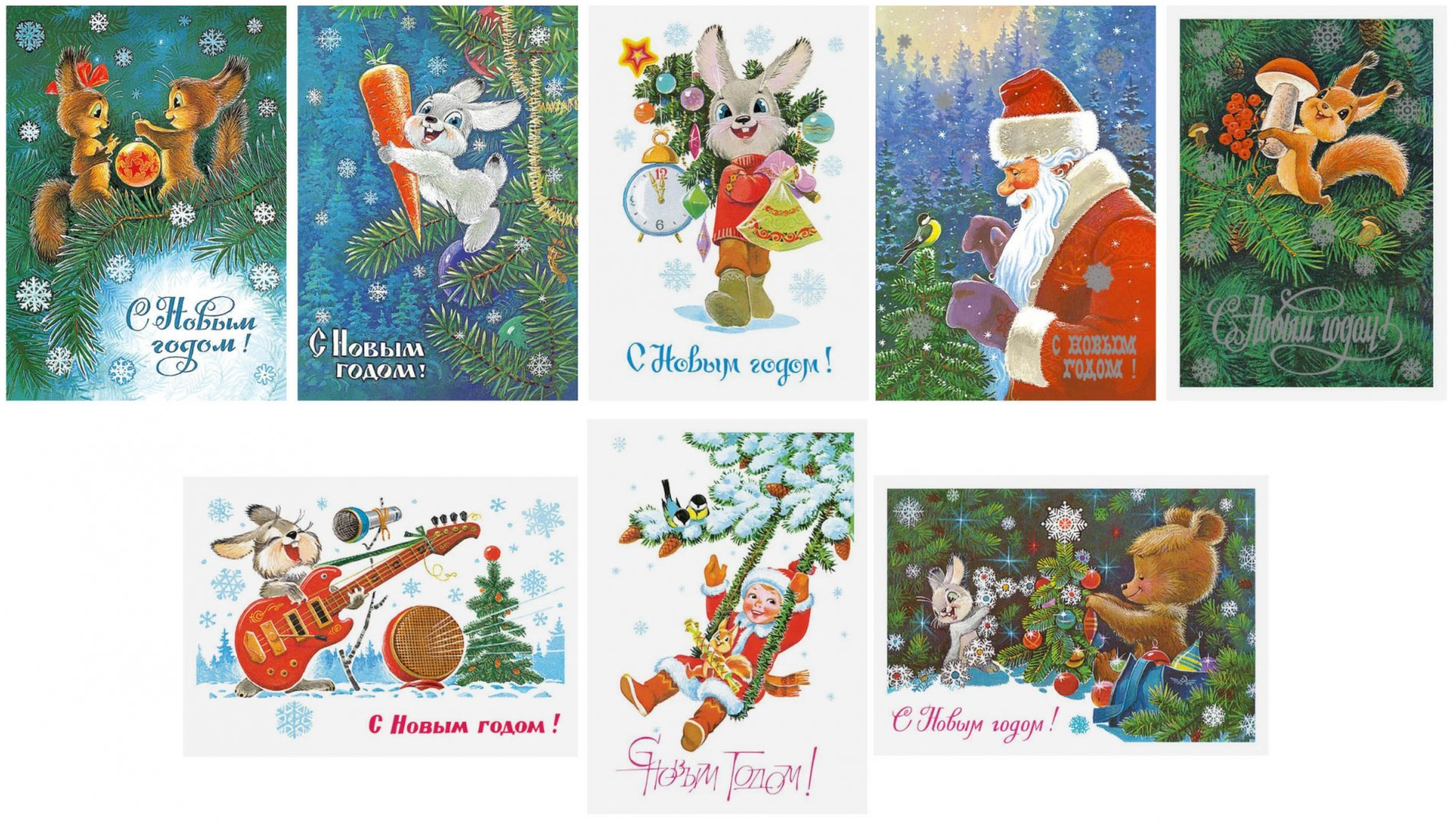 New Year's is just around the corner. Our most beloved holiday is hurrying to us. What's happening in the New Year's forest? How do the bears, squirrels, and bunnies celebrate the holiday? Are they expecting gifts, and is Father Frost hurrying to visit them? Vladimir Ivanovich Zarubin's cheerful, playful postcards will tell you all about this and much more. A classic of postcard miniatures and a beloved artist among children, he spent decades congratulating millions of Soviet people on the New Year. These postcards were the beginning of New Year's miracles.