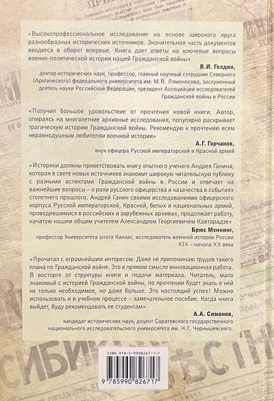 Who were the officers with? What was the role of the Cossacks? Could the SRs have won? What role did the special services play? Did the Reds take the families of military officers hostage? Why was Admiral A.V. Kolchak defeated? Why did the Red Army win? One of the leading modern researchers in this field, Doctor of Historical Sciences A.V. Ganin, one of the most pressing questions of the military-political history of the Russian Civil War of 1917-1922, answers. The monograph is based on unique documents from 27 Russian and foreign archives, including recently declassified archives of special services.