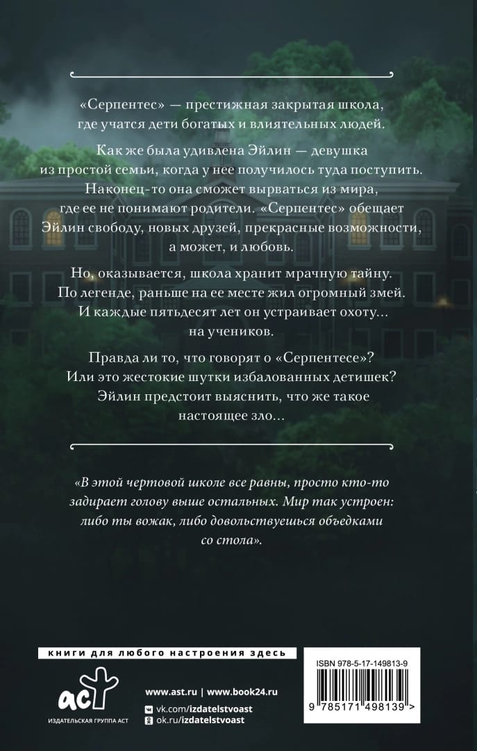 "Serpentes" is a prestigious closed school where children of rich and influential people study. How surprised Eileen, a girl from a simple family, was when she managed to enter the school. Finally she will be able to escape from the world where her parents do not understand her. "Serpentes" promises Eileen freedom, new friends, wonderful opportunities, and maybe even love. But it turns out the school harbors a dark secret. Legend has it that a huge serpent used to live there. And every 50 years, he hunts the students. on the students. Is it true what they say about Serpentes? Or are they the cruel jokes of spoiled children? It's up to Eileen to find out what real evil is...