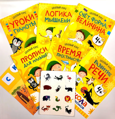 The Basic Course consists of 6 books on the main areas of development (speech, counting, fine motor skills, logic, literacy, thinking) and educational games to consolidate the material (playing field, chips and game scenarios).