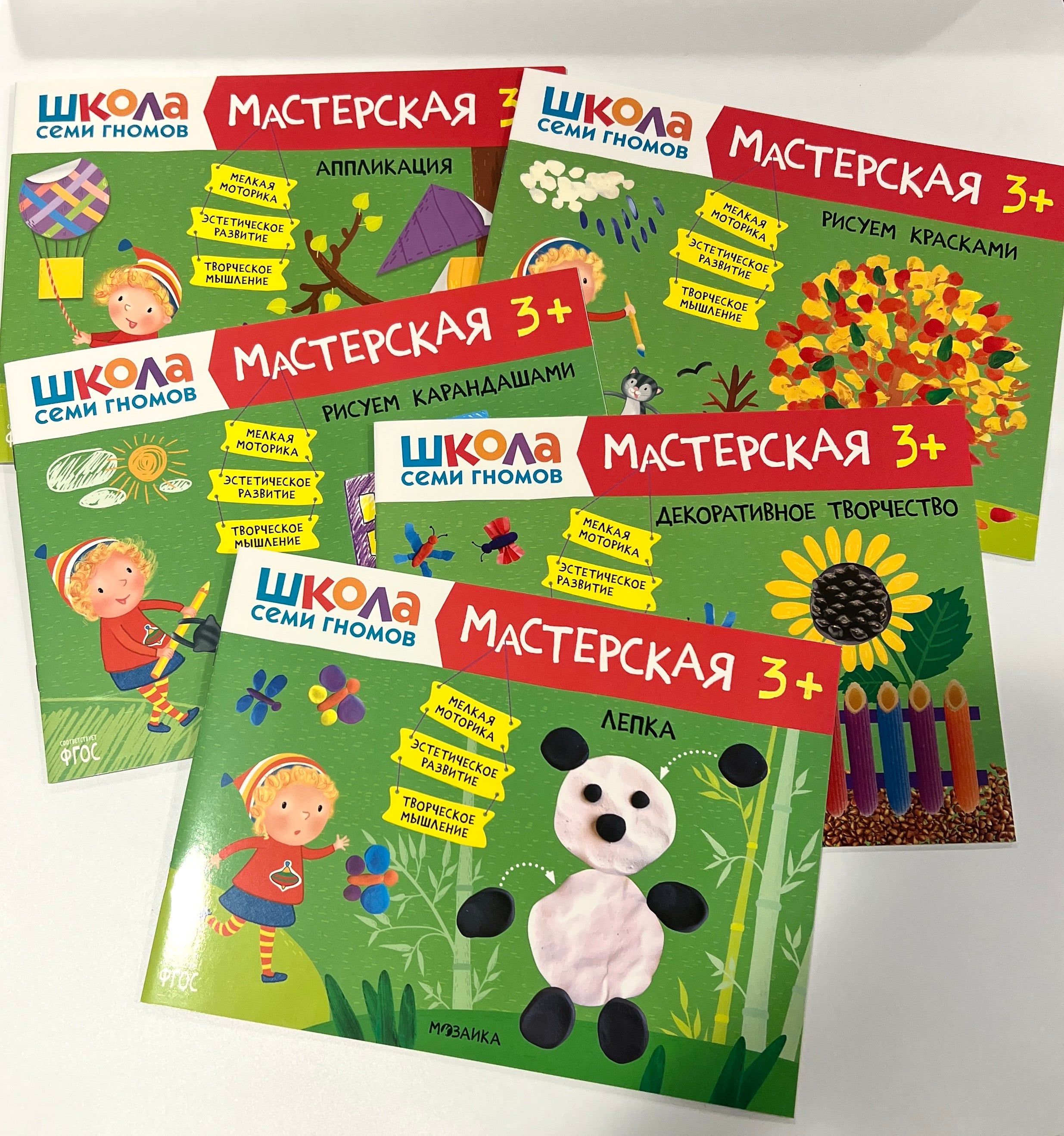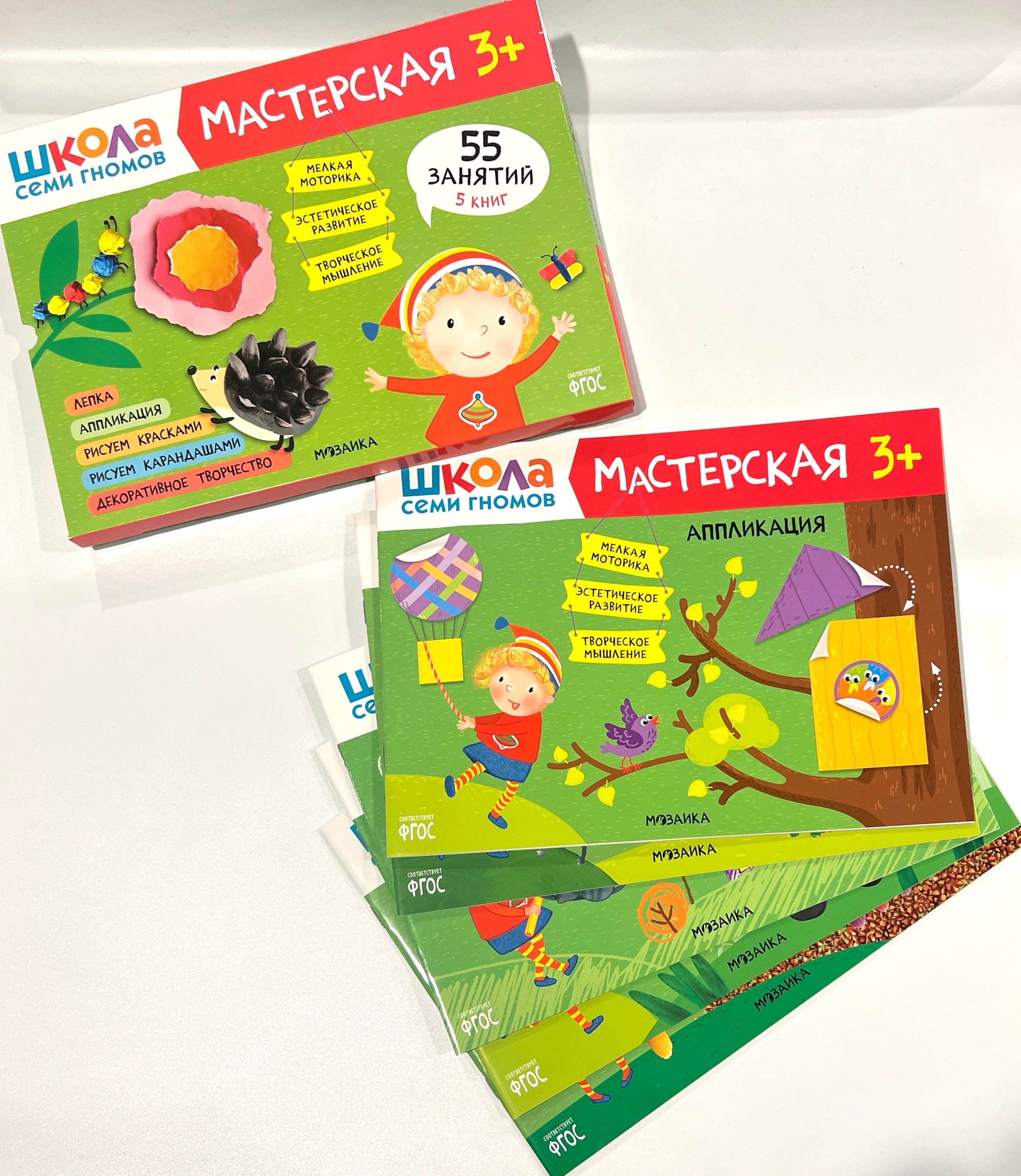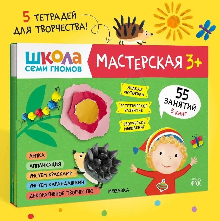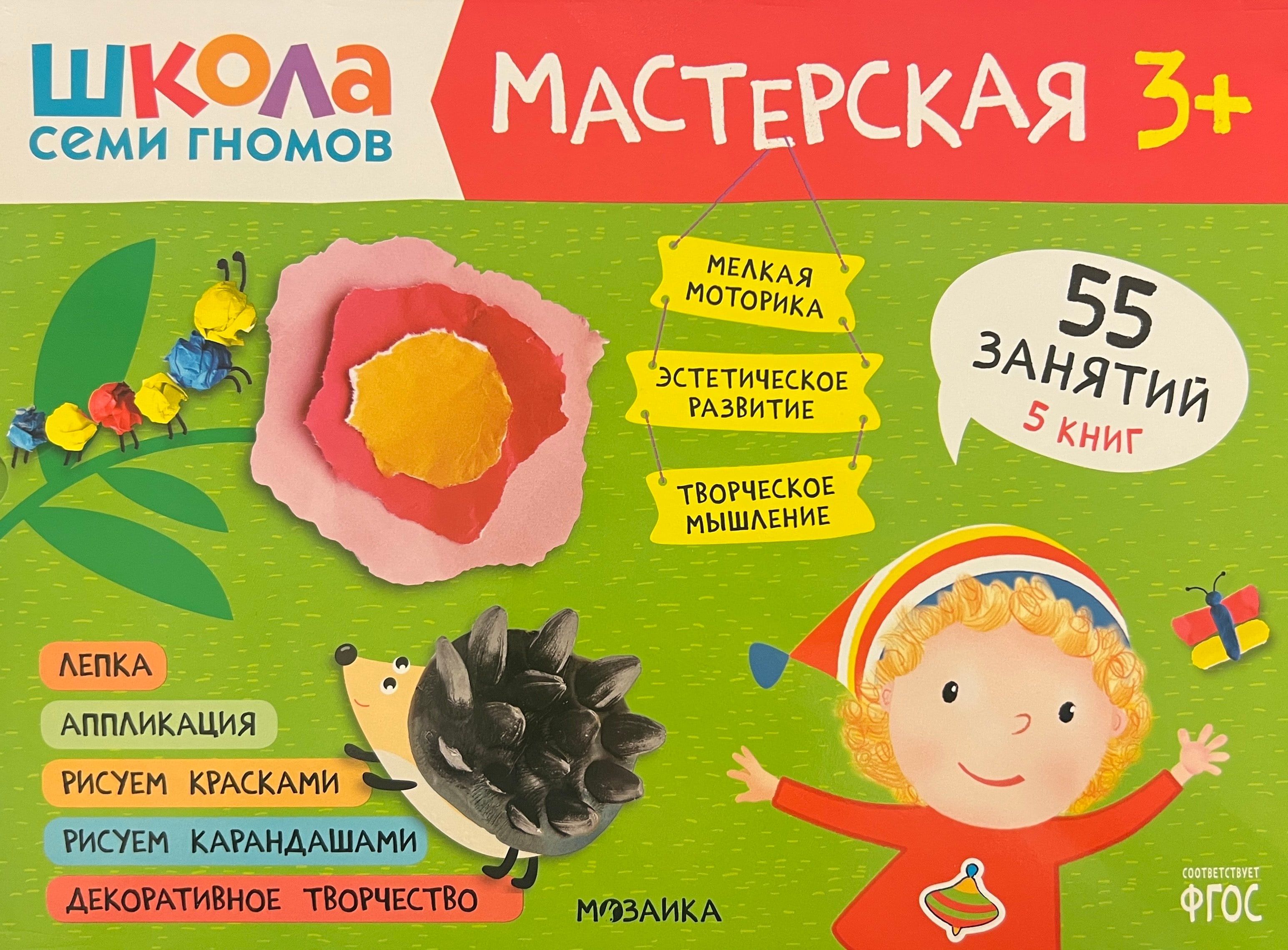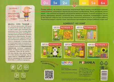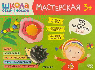 "School of the Seven Dwarfs. Workshop 3+" is a set of colorful albums for exciting creative activities with children aged 3 to 4. Activities on topics that are close and understandable to the child are arranged in order of complexity: gradually moving from mastering simple skills to more complex tasks. The result of each lesson will be a finished work that the child created himself. At the end of the album, a large final task awaits the little artist, where he will be able to apply all his new skills.