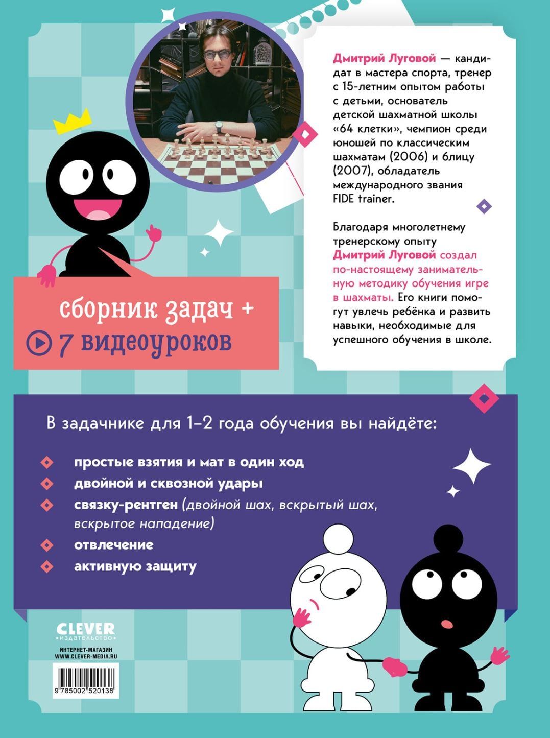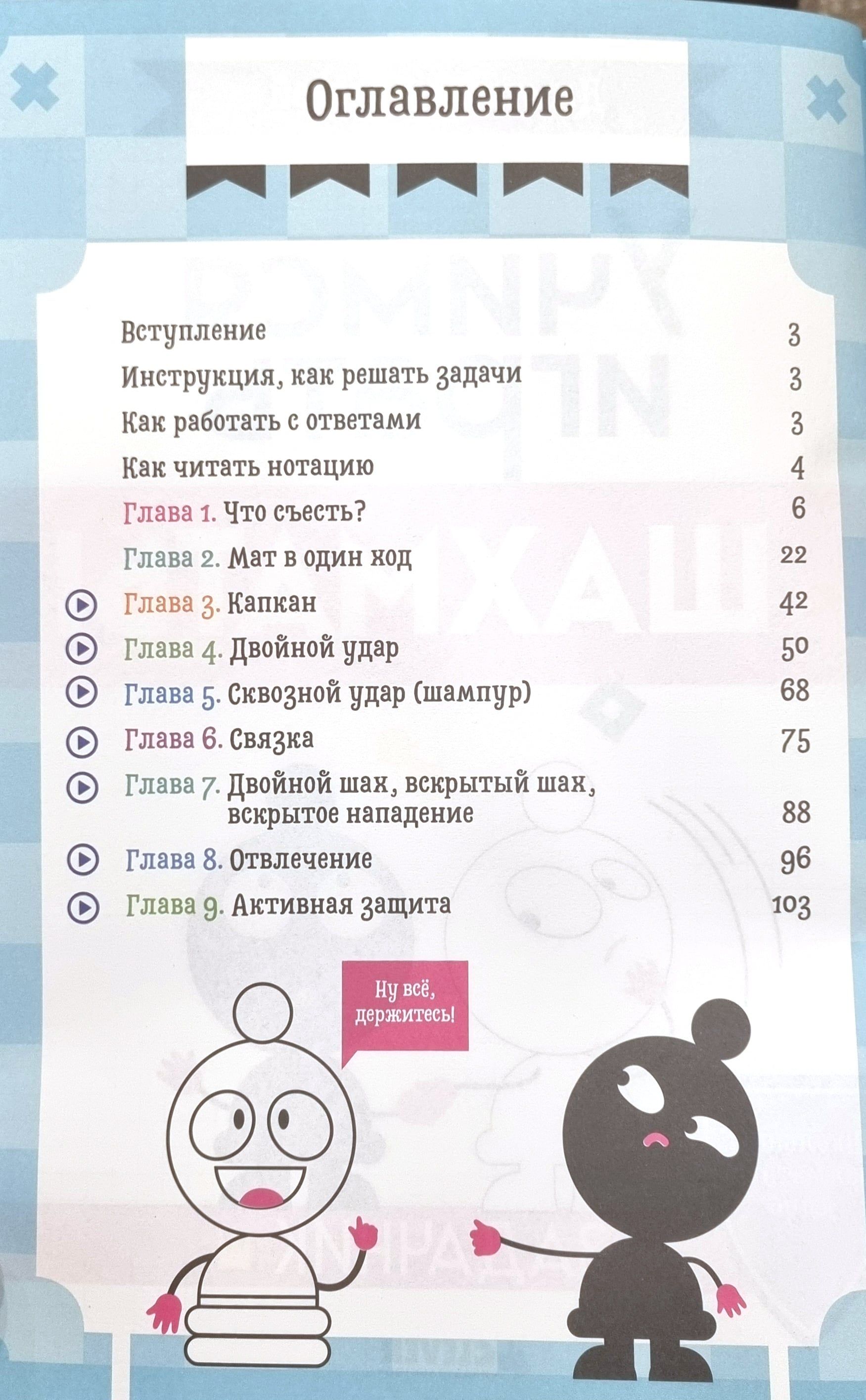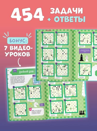 The book contains interesting problems and situations that will help young chess players improve their tactics and decision-making on the chessboard. Solving such problems is the main tool for training a chess player. Each section is devoted to certain aspects of the game - simple captures and checkmate in one move, double and through blows, X-ray ligament (double check, discovered check, discovered attack), distraction and active defense. Clear explanations, witty illustrations and step-by-step solutions will make learning easy and fun. Some topics have a QR code that leads to a video lesson where a particular tactical move is discussed.