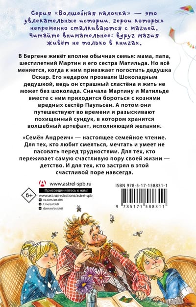 In Bergen lives a very ordinary family: mom, dad, six-year-old Martin and his older sister Mathilde. But everything changes when Grandpa Oscar comes to visit. His nickname is Chocolate Grandpa, because he is a terrible sweet tooth and can't live without chocolate. At first Martin and Matilda together with him have to fight the intrigues of the harmful Paulsen sisters. Then they travel back in time and search for a stolen chest that contains a magical artifact that grants wishes.