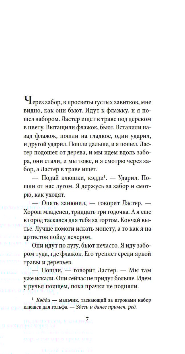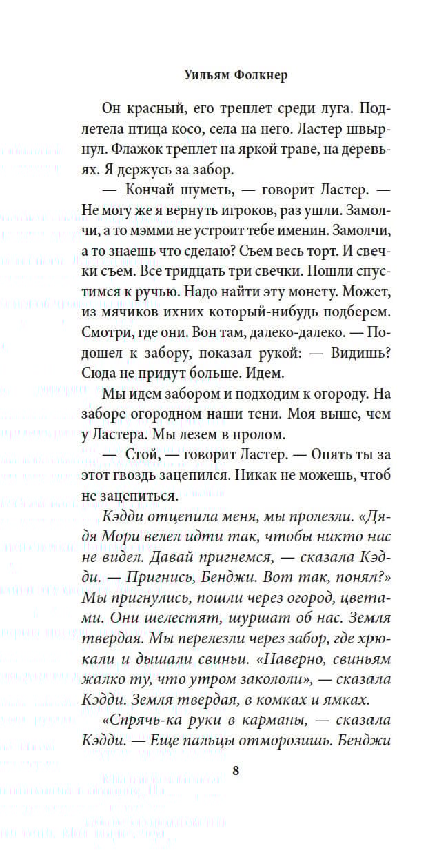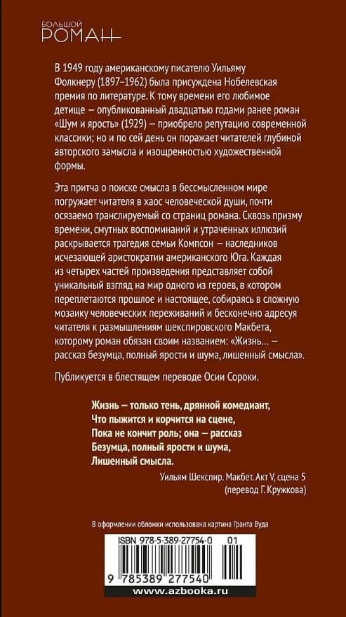 In 1949, American writer William Faulkner (1897–1962) was awarded the Nobel Prize in Literature. By that time, his beloved brainchild, The Sound and the Fury (1929), published twenty years earlier, had acquired a reputation as a modern classic; but to this day it amazes readers with the depth of the author’s conception and the sophistication of its artistic form. This parable about the search for meaning in a meaningless world immerses the reader in the chaos of the human soul, which is almost tangibly transmitted from the pages of the novel. Through the prism of time, vague memories and lost illusions, the tragedy of the Compson family, heirs to the disappearing aristocracy of the American South, is revealed. Each of the four parts of the work is a unique view of the world of one of the heroes, in which the past and the present are intertwined, gathering into a complex mosaic of human experiences and endlessly referring the reader to the thoughts of Shakespeare's Macbeth, to whom the novel owes its title: "Life... is a madman's tale, full of fury and noise, devoid of meaning." Published in a brilliant translation by Hosea Soroka.