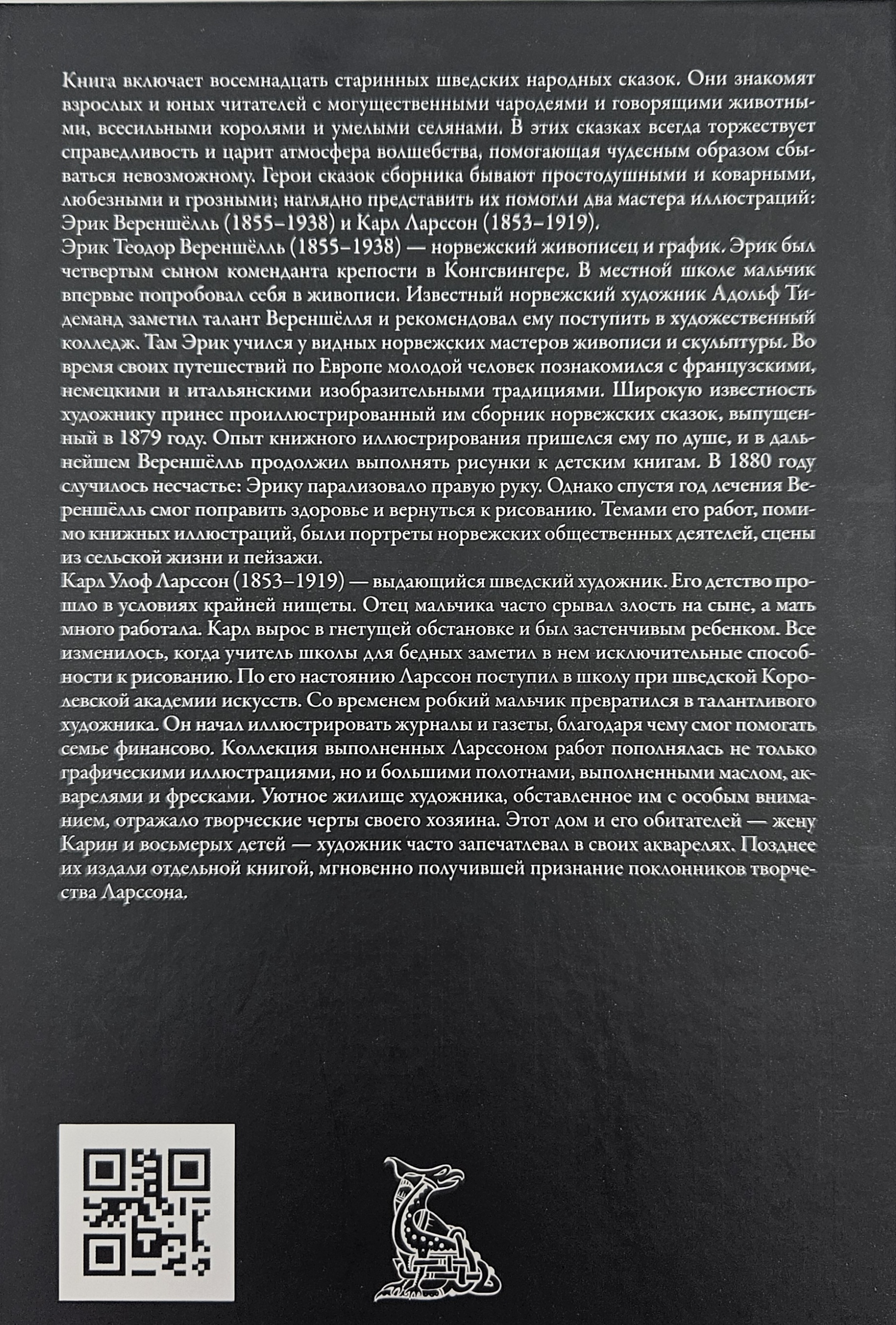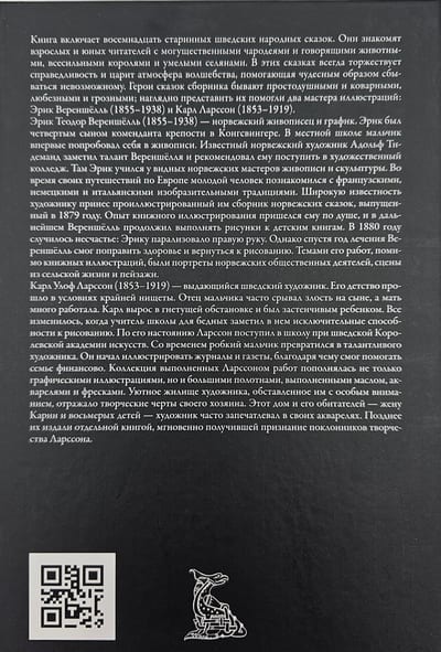 This edition includes eighteen old Swedish folk tales. They introduce powerful sorcerers, beautiful princesses, talking animals and skilled craftsmen to both adults and young readers. Justice always triumphs in these tales and an atmosphere of magic reigns, helping the impossible to miraculously come true. Two outstanding artists, Erik Werenskiöll (1855–1938) and Carl Larsson (1853–1919), helped to present the heroes of the tales, honest and cunning, good-natured and merciless. Erik Theodor Werenskiöll (1855–1938) was a Norwegian painter and graphic artist. Erik was the fourth son of the commandant of the fortress in Kongsvinger. At the local school, the boy first tried his hand at painting. The famous Norwegian artist Adolf Tidemand noticed Werenskiöll's talent and recommended that he enroll in art college. There, Eric studied with prominent Norwegian masters of painting and sculpture. During his travels around Europe, the young man became acquainted with French, German and Italian pictorial traditions. The artist became widely known for his illustrated collection of Norwegian fairy tales, published in 1879. He enjoyed the experience of book illustration, and subsequently Werenskiöll continued to draw for children's books. In 1880, a misfortune occurred: Eric's right arm was paralyzed. However, after a year of treatment, Werenskiöll was able to improve his health and return to drawing. In addition to book illustrations, his works included portraits of Norwegian public figures, scenes from rural life and landscapes. Carl Olof Larsson (1853–1919) was an outstanding Swedish artist. He spent his childhood in extreme poverty. The boy's father often took out his anger on his son, and his mother worked a lot. Carl grew up in an oppressive environment and was a shy child. Everything changed when a teacher at a school for the poor noticed his exceptional talent for drawing. At his insistence, Larsson entered the school at the Swedish Royal Academy of Arts. Over time, the timid boy turned into a talented artist. He began illustrating magazines and newspapers, thanks to which he was able to help his family financially. The collection of works completed by Larsson was replenished not only with graphic illustrations, but also with large canvases made in oil, watercolors and frescoes. The artist's cozy home, furnished with special attention, reflected the creative features of its owner. This house and its inhabitants - his wife Karin and eight children - the artist often captured in his watercolors. Later, they were published as a separate book, which immediately received recognition from fans of Larsson's work.