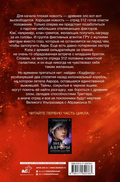 For starters, the bad news is that an ancient evil is about to be unleashed. The good news is that squad 312 is ready to save the day. Only first they have to take care of a couple of small distractions. Like the Gremp clan wanting a bounty on their heads. And a group of bogus GRU agents with creepy colors instead of eyes who will stop at nothing to get Avri. There's also Cal's long-lost sister with an army of Sildrati behind her back, not exactly thrilled to see her little brother. In short, Squad 312 has half the known galaxy on his tail, and he's never felt more welcome. But there's no time to hide: the Hadfield, a colonial ship that disappeared two centuries ago, has been found, carrying the Aurora, the sole survivor. The secrets hidden in the black box may help her find clues on how to fight an ancient evil by mastering Trigger's powers, or else the squad and all their fans will be deader than the Great Ultrasaurus from Abraxis IV.
