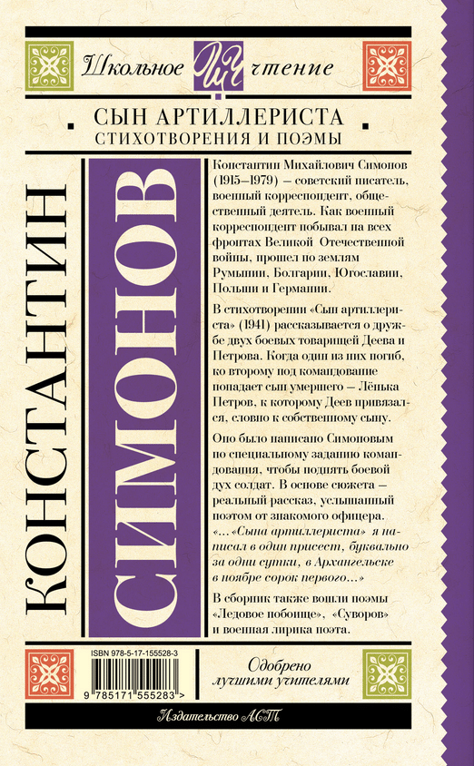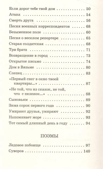 The poem "The Artilleryman's Son" (1941) tells the story of the friendship between two comrades, Deyev and Petrov. When one of them died, the other took command of the deceased's son, Lyonka Petrov, to whom Deyev became as attached as if he were his own son.