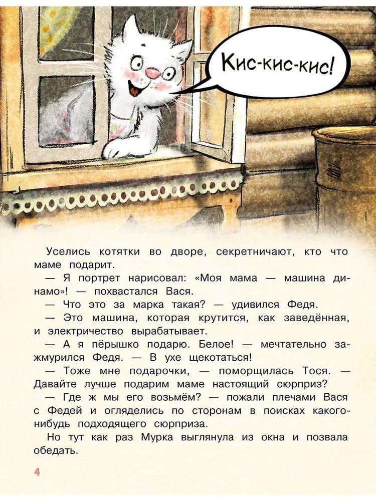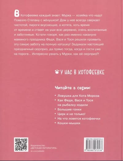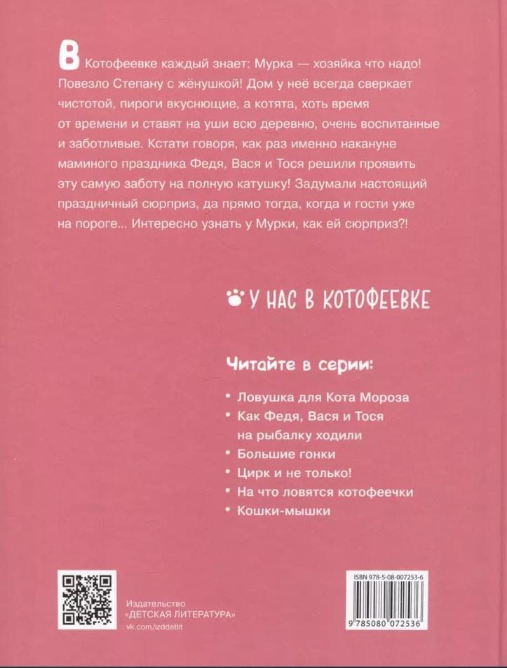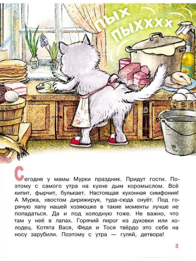 Everyone in Kotofeevka knows that Murka is a good housewife! Stepan is lucky to have a wife! Her house is always sparkling clean, her pies are delicious, and her kittens, though they occasionally set the whole village on edge, are very well-mannered and caring. By the way, just on the eve of their mother's holiday Fedya, Vasya and Tosya decided to show this very care to the fullest! They planned a real holiday surprise, right when the guests are already on the doorstep.... I wonder how Murka feels about the surprise!