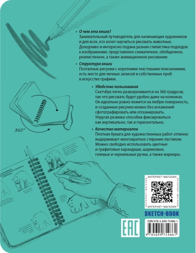This is a modern book. It is designed for those seeking new forms of creative expression. It is a practical book. Take notes, plan tasks, record lectures—and draw alongside: create and unwind. This is a convenient book. It lies flat on the table and unfolds 360 degrees. It has beautiful, thick paper that doesn't let paint bleed through. Frame-by-frame drawings are an unobtrusive introduction to basic drawing skills. This is an artistic book. With every page you fill, it becomes more beautiful.