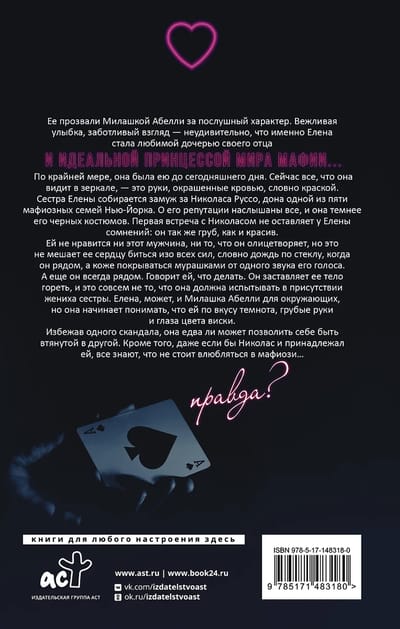They called her Sweetie Abelli for her obedient nature. A polite smile, a caring look - it's no wonder that Elena became her father's favorite daughter and the ideal princess of the mafia world... At least, she was until today. Now all she sees in the mirror are her hands, stained with blood, like paint. Elena's sister is getting married to Nicholas Russo, the don of one of the five New York mafia families. Everyone has heard of his reputation, and it is darker than his black suits.
