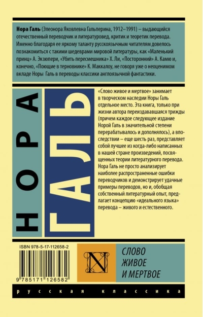 "The Word of the Living and the Dead" occupies a separate place in the creative legacy of Nora Gal. This book, which was reprinted three times during the author's lifetime alone (and each subsequent edition was substantially revised and supplemented by Nora Gal), and subsequently six more times, is the best work ever written in our country on the theory of literary translation.