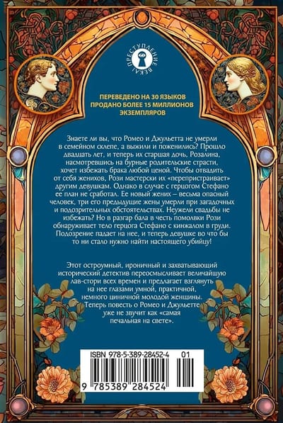 How might Romeo and Juliet's lives have turned out if they hadn't died in the family vault, but had survived, married, and had children? Rosaline, the Montagues' eldest daughter, a twenty-year-old spinster, is nothing like her romantic parents. She sees love as a tedious endeavor, marriage a trap for fools. She is courted by Duke Stefano, a depraved despot whose three previous wives died under mysterious circumstances. But right during the engagement celebration, the Duke is found in the garden with a dagger in his chest.