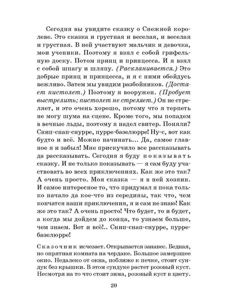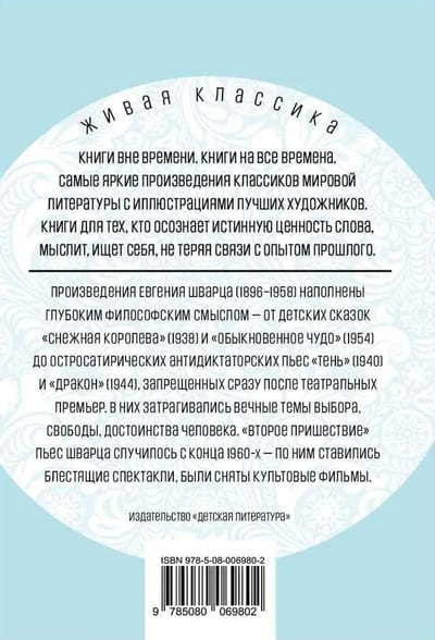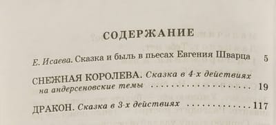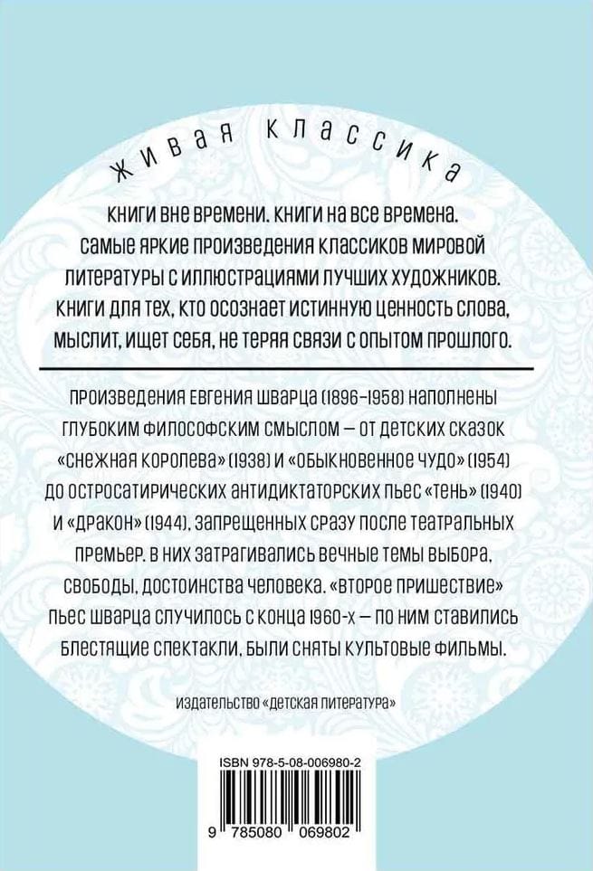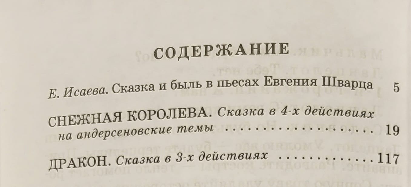 The collection of works by the remarkable playwright, storyteller, screenwriter Eugene Schwartz includes the fairy tale plays "The Snow Queen" (1938) and "The Dragon" (1944). In them in the scale of eternal fairy-tale truths the realities of the author's contemporary epoch are comprehended, which have not lost their relevance in our days.