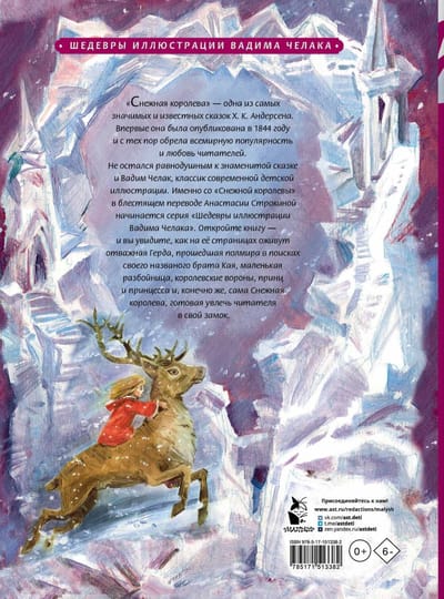 “The Snow Queen” is one of the most significant and famous fairy tales of H. K. Andersen. It was first published in 1844 and has since gained worldwide popularity and readership. Not indifferent to the famous fairy tale and Vadim Chelak, a classic of modern children's illustration. It is with the “Snow Queen” in the brilliant translation of Anastasia Strokina that the series “Masterpieces of Illustrations by Vadim Chelak” begins.