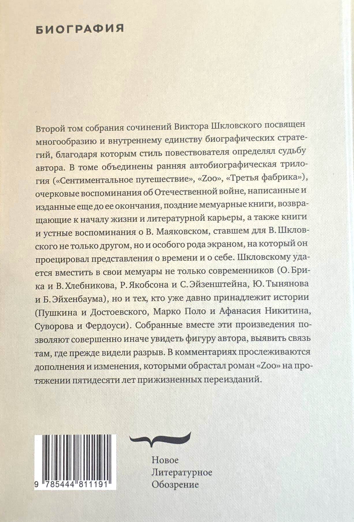 The second volume of Viktor Shklovsky's collected works explores the diversity and internal unity of the biographical strategies through which his narrative style shaped his fate. The volume brings together his early autobiographical trilogy ("Sentimental Journey," "Zoo," and "The Third Factory"), essays about the Great Patriotic War written and published before its end, later memoirs that return to the beginning of his life and literary career, and books and oral recollections of Vladimir Mayakovsky, who became not only a friend for Shklovsky but also a special kind of screen onto which he projected his ideas about his time and himself. Shklovsky manages to incorporate into his memoirs not only his contemporaries (O. Brik and V. Khlebnikov, R. Jakobson and S. Eisenstein, Yu. Tynyanov and B. Eikhenbaum), but also those whose names have long belonged to history (Pushkin and Dostoevsky, Marco Polo and Afanasy Nikitin, Suvorov and Ferdowsi). Collected together, these works allow us to see their author in a completely different light, revealing connections where previously we saw a gap. The commentary traces the additions and changes that the novel "Zoo" acquired over fifty years of reprints during his lifetime.