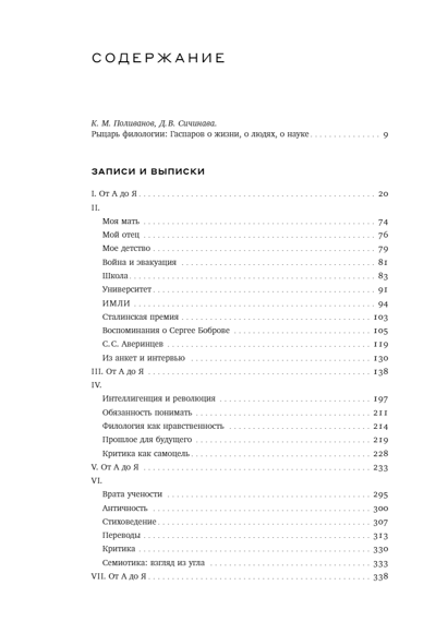 The first posthumous collection of M. L. Gasparov's works (in six volumes) aims to convey as fully as possible the multifaceted nature of his scientific interests and to present the main directions of his work. The materials collected in the sixth and final volume familiarize us with the scholar's thoughts about science and people in it, about his profession and research methods, about enlightenment and education, about the place of philology and humanitarian knowledge in general in our daily lives. The volume opens with the book "Notes and Extracts", compiled by Gasparov from fragments of his notebooks, supplemented by reminiscences, letters, answers to questionnaires and interviews. Articles, reviews, prefaces, notes, programs and outlines of small lecture courses, memoir fragments, letters, questionnaires and interviews, also included in the volume, supplement this book to a great extent. The reader - as if from the inside, through the eyes of one of the brightest scholars, a classical philologist, a researcher of the history of Russian poetry, and a poet - will be able to look at the most fruitful era in the development of humanitarian knowledge, which turned out to be the last four decades of the twentieth century, to visualize the logic of research thought, and to get acquainted with M. L. Gasparov's scientific and literary tastes and preferences.