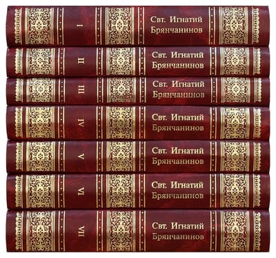 The collected works of Saint Ignatius Brianchaninov, presented in seven volumes, include the Bishop of the Caucasus and Black Sea region's major works: "Ascetic Experiences," "A Sermon on Death," "A Sermon on Man," "Ascetic Sermon," "An Offering to Modern Monasticism," "The Patericon," as well as a collection of his letters, compiled from the "Complete Collection..." with the exclusion of all letters and individual passages that do not contain moral or edifying value. This edition is presented in a deluxe edition. The book binding is blind-stamped and embossed with gold foil.
