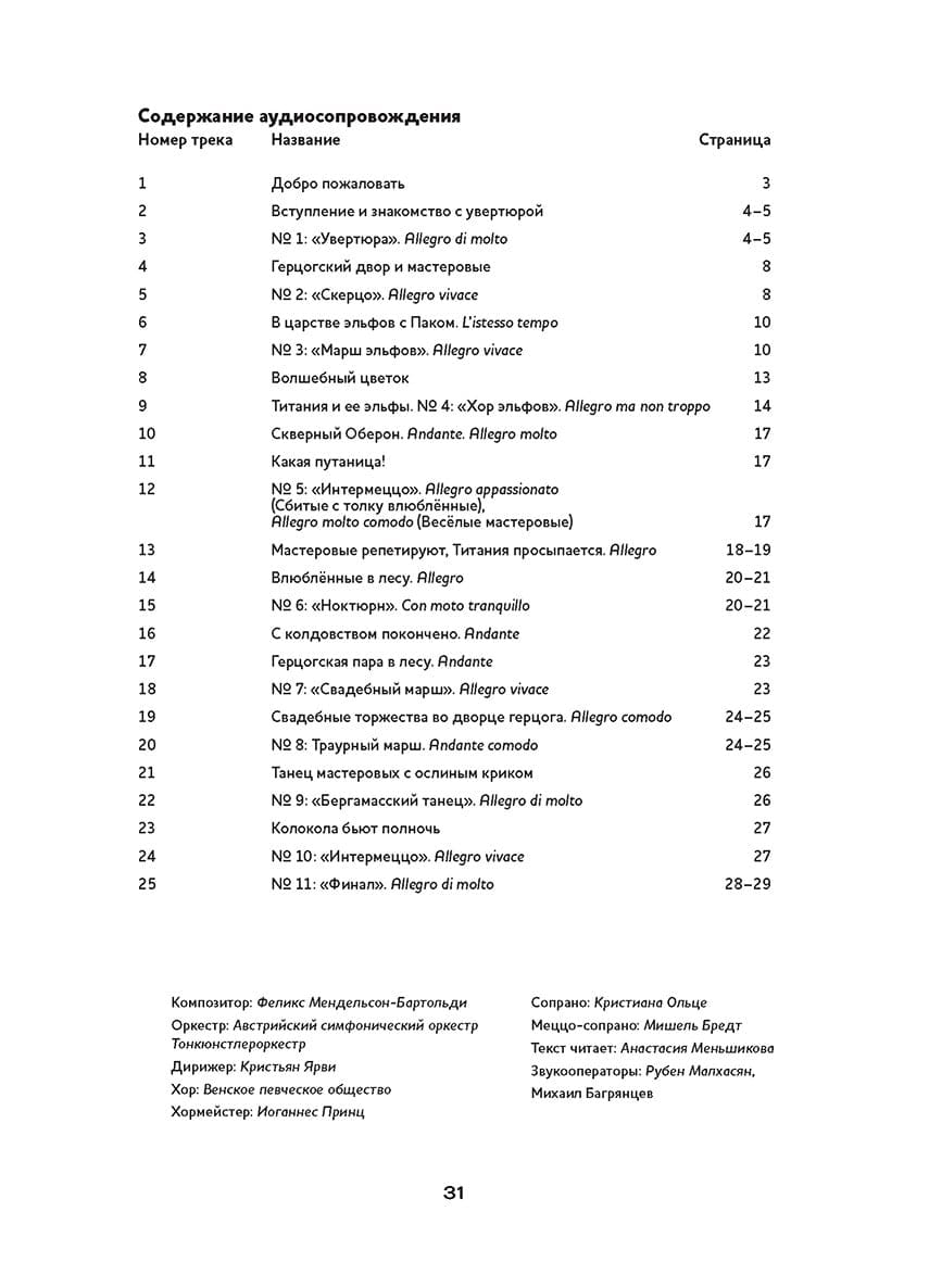 Enchanting sounds of music and fairy tale world on the pages of children's books! We present a collection that will not leave any adult or young reader indifferent! The series "Musical Classics for Children" from the publishing house "Content" was created with the assistance of the Moscow Drama Theater named after M. N. Ermolova. In the books of this series you will find a unique combination: librettos of the most famous masterpieces of world musical classics, adapted for children of preschool and primary school age, supplemented with a disk with melodies from the works themselves and interesting comments. The audio accompaniment is available via QR code or on CD. The text is read by Anastasia Menshikova. In this book young readers will find a funny and fascinating story about the night adventures of noble young people, as well as elves and simpletons-masters. All of them are characters from William Shakespeare's fairy-tale comedy written in 1594-1596. Felix Mendelssohn's concert overture, composed for the production of this comedy at the court of King Frederick-Wilhelm IV, will transport children and their parents to the forests near Athens, where mischievous elves use magic charms to confuse young people in love and fool idle artisans who have gone to the forest to rehearse.