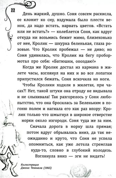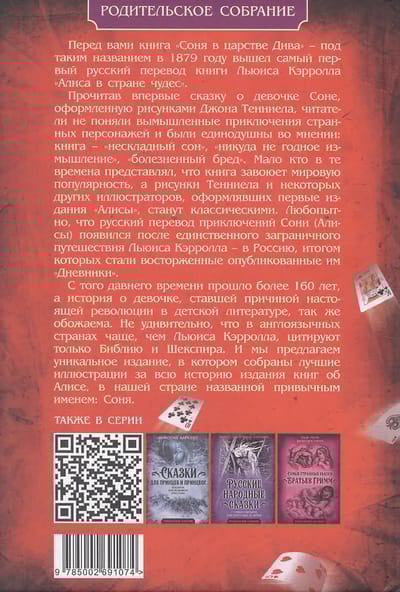 This is the book "The Dormouse in the Kingdom of Wonders"—the title of the very first Russian translation of Lewis Carroll's Alice in Wonderland, published in 1879. Upon first reading the tale of the little girl Dormouse, illustrated by John Tenniel, readers were baffled by the fictional adventures of the strange characters and were unanimous in their opinion: the book was "an awkward dream," "a worthless invention," and "a morbid delirium." Few at the time imagined that the book would gain worldwide popularity, and that Tenniel's illustrations, along with those of several other illustrators who illustrated the first editions of Alice, would become classics. Interestingly, the Russian translation of the Dormouse's (Alice's) adventures appeared after Lewis Carroll's only foreign trip—to Russia, which culminated in his enthusiastically published Diaries. More than 160 years have passed since that time, and the story of the girl who sparked a revolution in children's literature remains just as beloved. It's no wonder that in English-speaking countries, only the Bible and Shakespeare are quoted more often than Lewis Carroll. We offer a unique edition, featuring the best illustrations from the entire history of Alice books, known in our country by her familiar name: Dormouse.