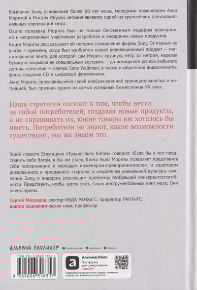 Today, it's hard to imagine the global consumer electronics market without Sony products. The author, one of the founders of Sony, recounts the company's history, the development of the Walkman, the Betamax VCR, the compact disc, and other unique inventions. The book details the relationships between big business and the government, trade unions, and competitors, as well as the distinctive features of Japanese management, particularly the perception of the corporation as a family. In postwar Japan, Morita had to create virtually everything, even management approaches, from scratch, shaping a new entrepreneurial culture and traditions. The book is intended for a wide audience.