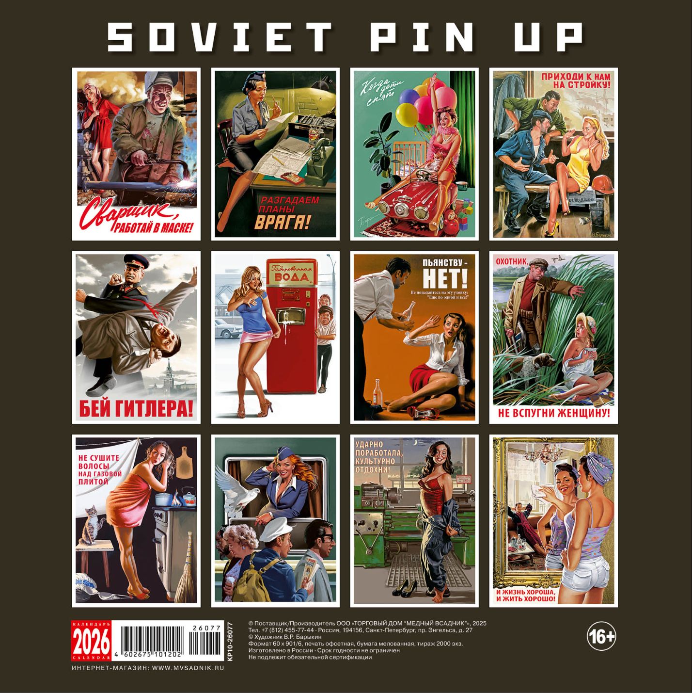 The Pin Up 2026 wall calendar introduces the work of contemporary artist Valery Barykin, who created a mix of the mid-20th century graphic style popular in the USA and the Soviet poster of the 1950s and 1960s.