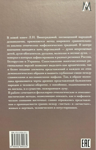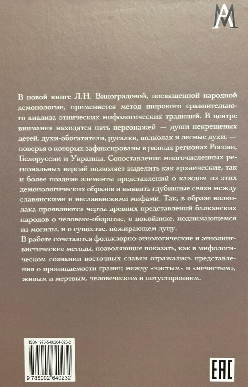 L. N. Vinogradova's new book on folk demonology employs a broad comparative analysis of ethnic mythological traditions. It focuses on five characters—the souls of unbaptized children, enrichment spirits, mermaids, the werewolf, and forest spirits—whose beliefs are recorded in various regions of Russia, Belarus, and Ukraine. A comparison of numerous regional versions allows us to identify both archaic and more recent elements in the conceptions of each of these demonological figures and reveal deep connections between Slavic and non-Slavic myths. For example, the werewolf reveals features of ancient Balkan beliefs about werewolves, the dead rising from the grave, and a creature devouring the moon.