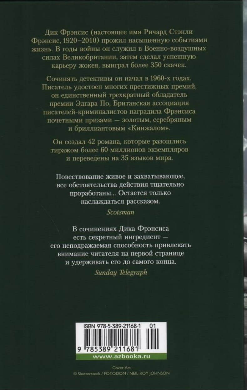 Dick Francis (1920–2010) is one of the most renowned British detective writers. During his lifetime, he wrote over 30 internationally acclaimed bestsellers. His novels primarily focus on the world of horse racing, which Francis knew firsthand, as he was born into a family of jockeys and was a famous jockey himself. This world is full of excitement, rife with passions surrounding magnificent horses and high stakes in sports betting, and ripe for the taking for swindlers. This collection includes captivating novels written at the turn of the 1960s and 1970s: "Bet the Big Short," "Investigation," "Fracture," and "The Devil's Cocktail."