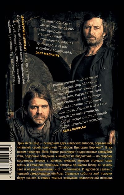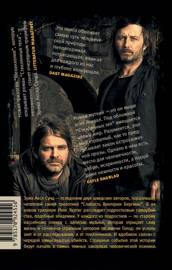 The new trilogy of Erik Aksla Sunda "Melancholia" opens the acute novel "Glass Bodies" (2014), in which the main character, Commissioner Jens Hurtig investigates teen suicides, like an epidemic spreading across Sweden: in different parts of the country, teenagers take their own lives in the most gruesome ways. The only thing they have in common is that each of them is found to have an old cassette player with music that makes even the police's blood run cold. The author of this music is someone named Hunger, elusive and mysterious, on whom both investigators and fans of music lovers unsuccessfully try to reach. But soon Jens Hurtig realizes that the suicides of teenagers in the most incredible way connected with a series of murders of influential people ... At first glance, the disparate details are woven into a tangle, which the novel's heroes try to unravel, each in his own way.