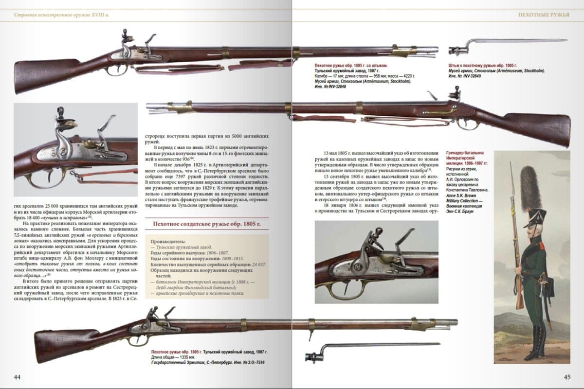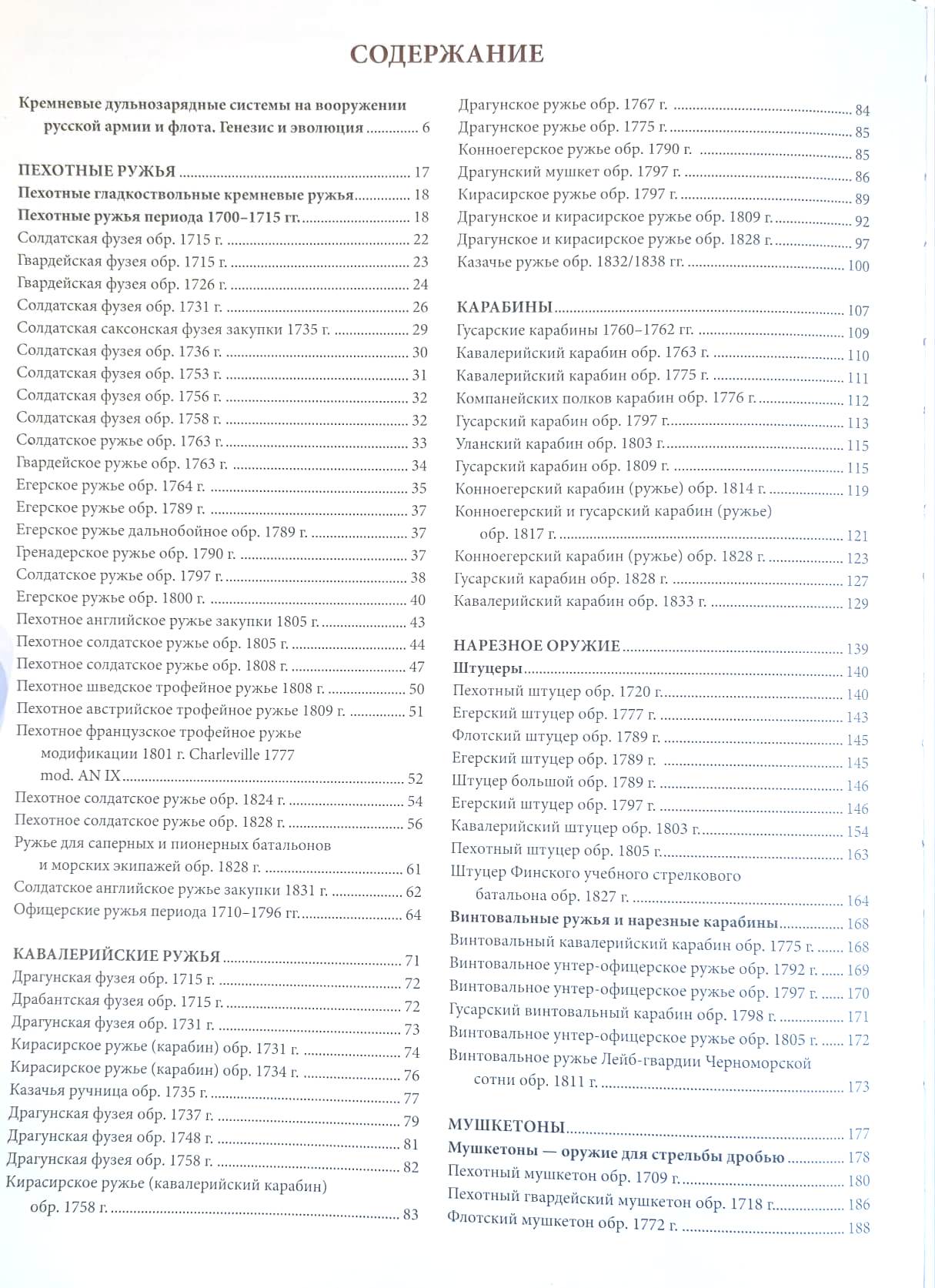 This reference book is devoted to the history and evolution of firearms used by the Russian army and navy from 1700 to 1853. The timeframe covered is defined by the period of practical use of muzzle-loading systems for long- and short-barreled firearms, where the flintlock was the primary ignition element of the powder charge.