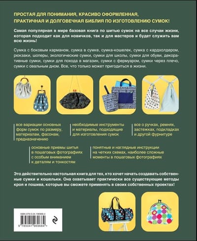 A huge collection of cutouts of almost all styles of bags with variations of sizes and materials, with detailed instructions on the sequence of cutting, sewing, assembly and finishing. The book, thanks to which you can create for yourself or to order absolutely any bag - from a smart clutch to a capacious backpack!