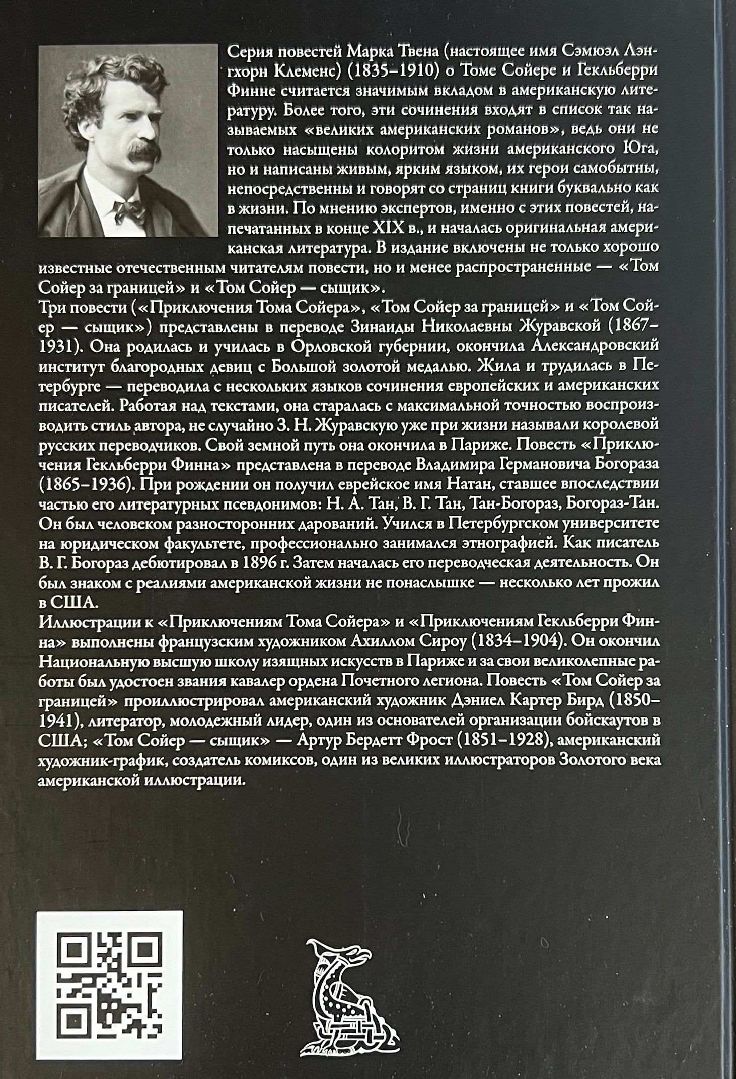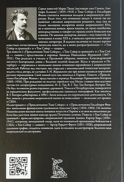 The book includes four stories by the classic of American literature Mark Twain (1835-1910) - "The Adventures of Tom Sawyer", "The Adventures of Huckleberry Finn", "Tom Sawyer Abroad" and "Tom Sawyer the Detective". The stories were translated into Russian by Zinaida Nikolaevna Zhuravskaya (1867-1937) and Vladimir Germanovich Tan-Bogoraz (1865-1936). The book is decorated with illustrations by French artist Achille Sirow (1834-1904) and American artists Arthur Burdett Frost (1851-1928) and Daniel Carter Byrd (1850-1941).