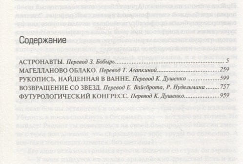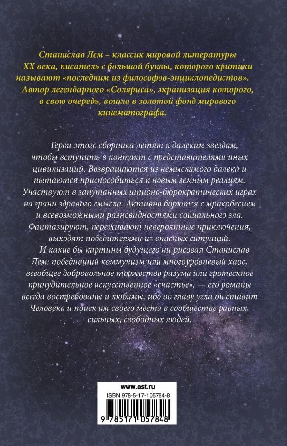 The heroes of this collection fly to distant stars to make contact with representatives of other civilizations. They return from unimaginable distances and try to adapt to new earthly realities. Participate in intricate spy-bureaucratic games on the edge of common sense. Actively fight against obscurantism and all sorts of social evil. Fantasize, experience incredible adventures, emerge victorious from dangerous situations. And - whatever pictures of the future Stanislav Lem draws: victorious communism or multi-level chaos, universal voluntary triumph of reason or grotesque forced artificial "happiness" - his novels are always in demand and loved, because at the heart of it puts Man and his search for his place in the community of equal, strong, free people.