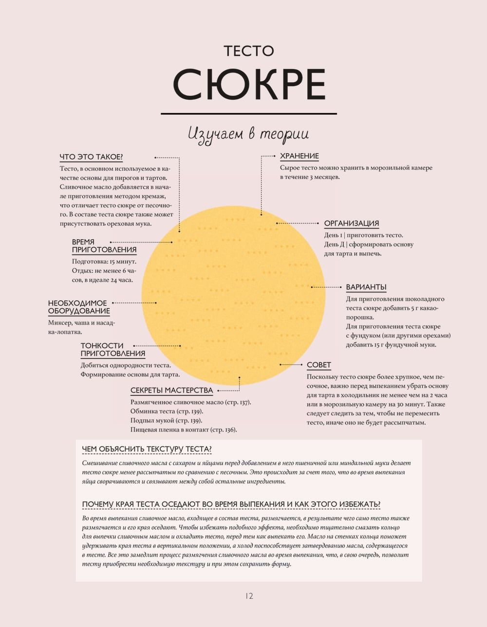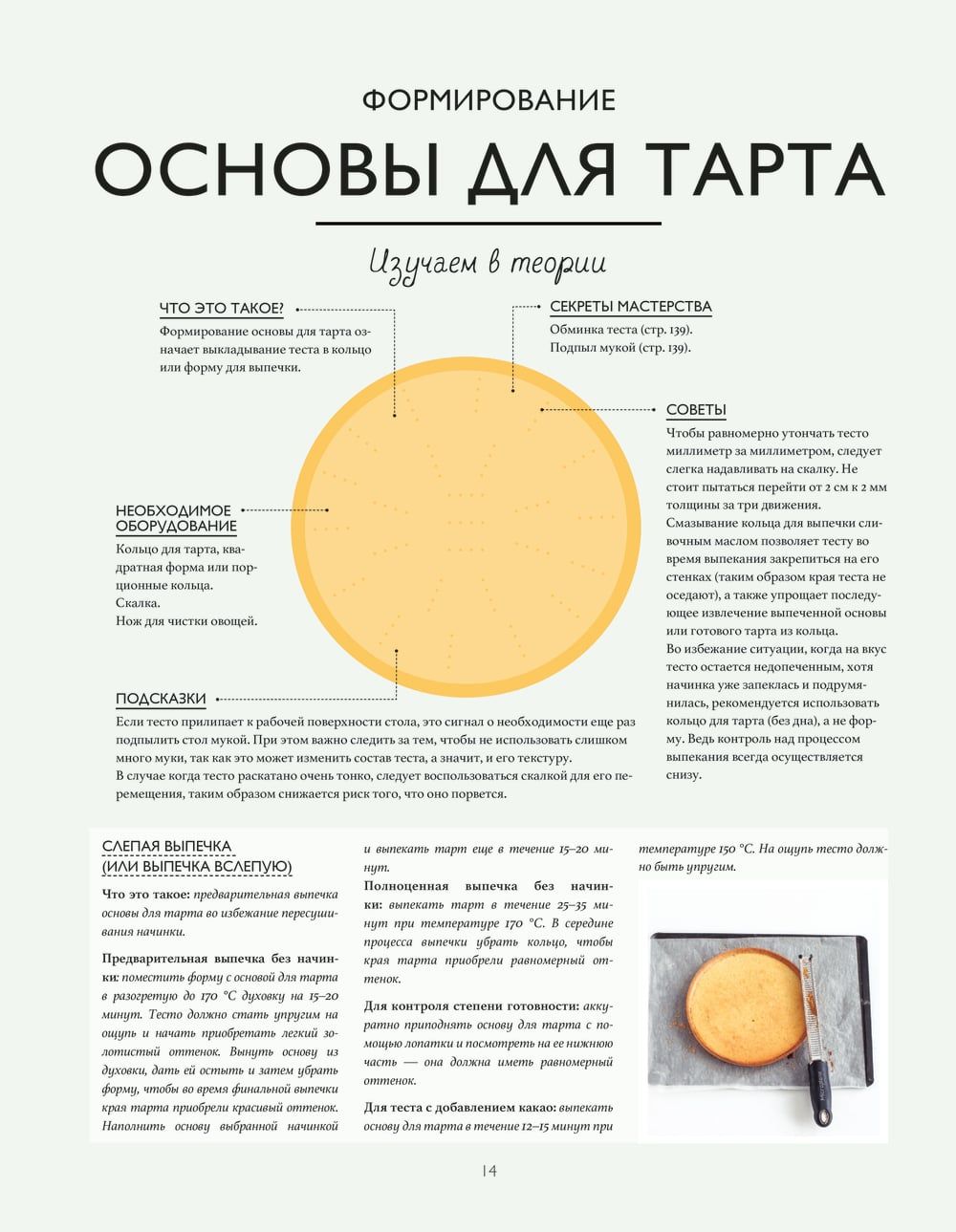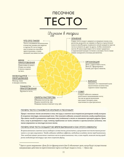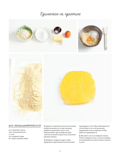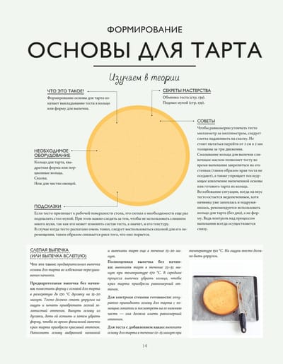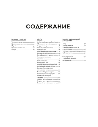 The book is a master class. The authors have chosen basic recipes to start with: pastry and biscuits, creams, ganache and caramel, meringues, mousses and glazes. This is what is the foundation of each tart. Then, when the base is mastered, the classic recipes are offered: tarts with fruits and berries, accompanied by chocolate, caramel or vanilla. And at the end, an illustrated glossary is given: decorations, fruit cuts, kitchen utensils and equipment, basic techniques and methods. Each recipe is divided into two parts: "study in theory" (product diagram with explanations), "put into practice" (step-by-step photos and preparation). All processes are thoroughly disassembled and clearly shown. After getting acquainted with the book, you leave with the feeling that you have been to a real master class and have become a real pro in creating tarts.