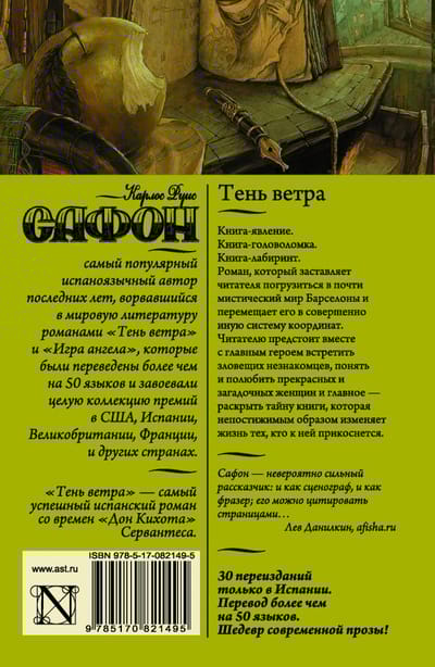A novel that forces the reader to plunge into the almost mystical world of Barcelona and moves him into a completely different system of coordinates. The reader will have to meet sinister strangers, understand and love beautiful and mysterious women, wander through the dark labyrinths of the past, and most importantly - to uncover the mystery of the book, which unfathomably changes the lives of those who touch it. An amazing book that has it all: a fascinating plot, a brilliant style, and mysteries that stir the imagination. TRUE LITERATURE!