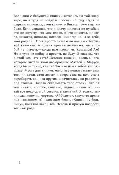 Katerina Suvorova, a former tour guide at the local art museum and a parishioner of the so-called Paper Church, an underground Christian circle, lives in a communal apartment in the fictional Soviet city of Tukhachevsk. Having been through the millstones of punitive psychiatry, Katerina is afraid of persecution and writes a secret diary intended for her son. In these notes, the heroine teaches him how to properly wash windows and pray, talks to him about Robinson Crusoe and the veneration of saints, and also tells him fragments of her own tragic biography. Her notebook is a testimony of great maternal love, which, upon closer inspection, turns out to be a testimony of a completely different kind: about the salvation of the soul through faith and compassion, which has no place in an inhumane system. Linor Goralik is a prose writer, poetess and journalist, author of the books The Name of Such-and-Such and Valery, published by NLO, as well as the study The Hollow Woman. Barbie's World from the Inside and Outside.