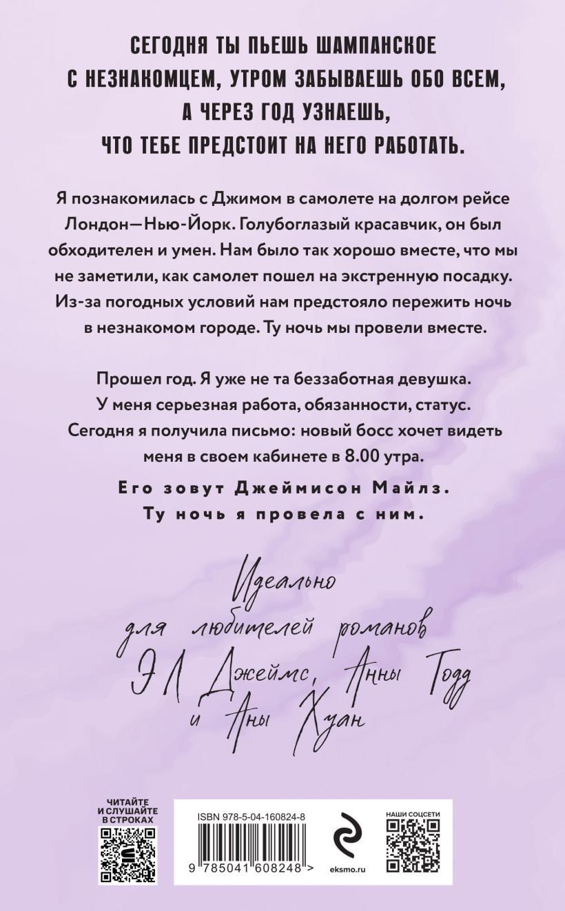 I met Jim on a plane, on a long flight from London to New York. A handsome blue-eyed man, he was polite and smart. We were so good together that we didn’t notice how the plane made an emergency landing. Due to the weather conditions, we had to survive the night in an unfamiliar city. We spent that night together. A year has passed. I am not that carefree girl anymore. I have a serious job, responsibilities, status. Today I received a letter; the new boss wants to see me in his office at 8:00 in the morning. His name is Jamison Miles. I spent that night with him.