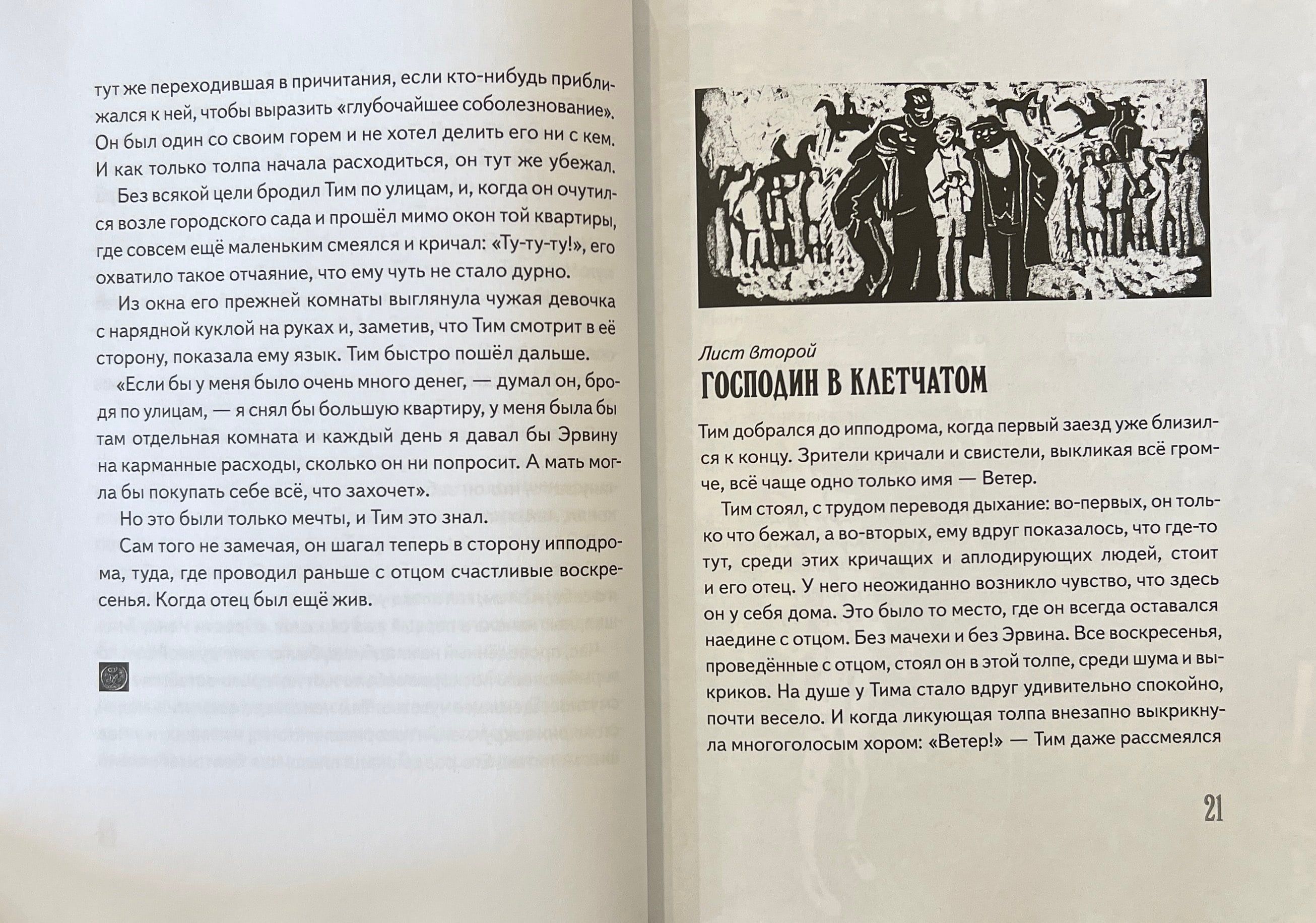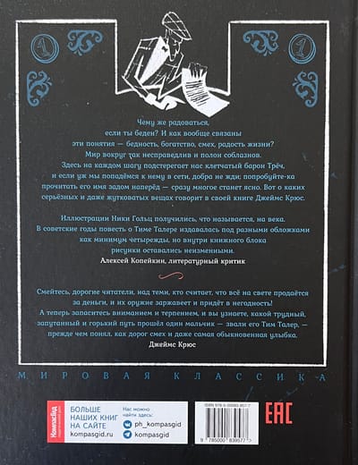 To change his life in an instant... To forget all the troubles, to cope with the trials - and to rush to happiness on the shortest and easiest way... This is the dream of the orphan Tim Thaler. He can't bear to live with his stepmother and mean stepbrother. And only Sunday trips to the racetrack brighten up the hero's everyday life. It is there, in the most desperate mood, the fourteen-year-old hero and meets Baron Tröch, who offers a magical salvation from all troubles. Tim Thaler will win any bet - if he agrees to a symbolic exchange: the boy only needs to give Tröch his laughter - only a real fool would refuse such a deal!... James Crews' story "Tim Thaler, or Sold Laughter", written in 1962, has long been a classic of teenage literature. Its 1981 Soviet film adaptation is still beloved by many Russian-speaking viewers. This children's Faust captivates with its fascinating plot and unique atmosphere: the book, set at the turn of the 1920s and 1930s in Germany, is imbued with a sense of catastrophe looming over Europe and the idea that even in this situation every person has the right to smile and the chance to be happy. The reissue is decorated with illustrations by Nika Goltz, familiar from childhood to Russian readers of several generations. However, some of the artist's works will be seen for the first time even by Tim Thaler's most devoted fans. For readers who have not yet had time to discover this text, the foreword by Alexei Kopeikin will help,