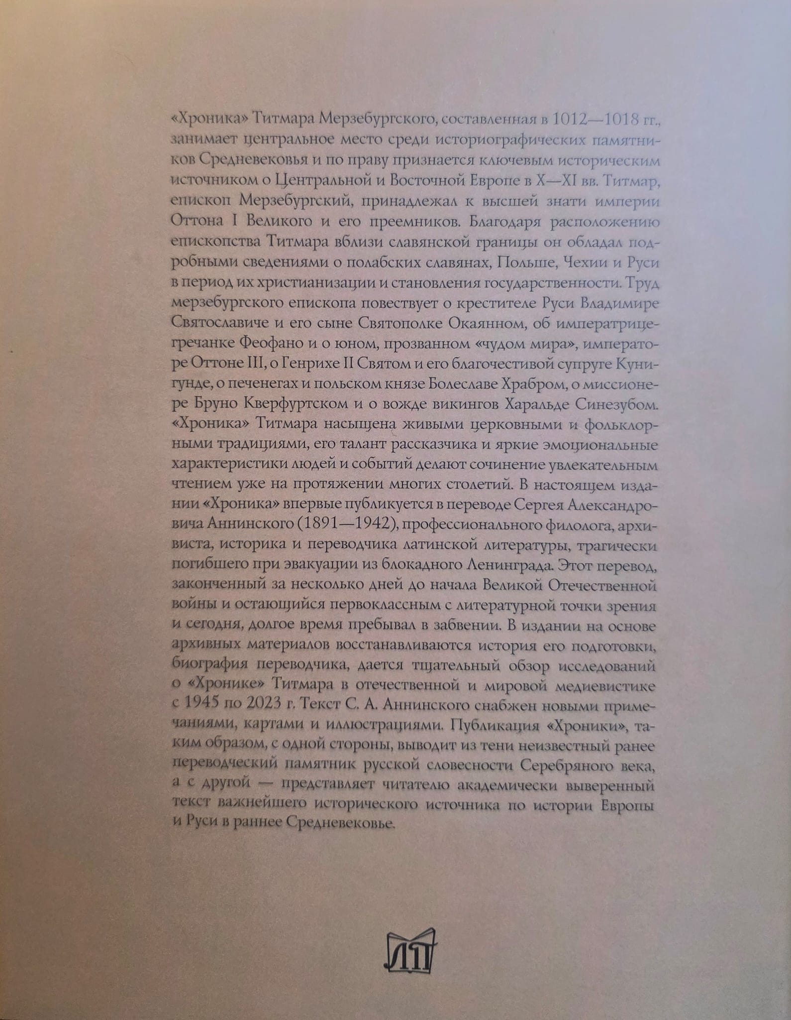An academic edition of Thietmar von Merseburg's "Chronicle" has been published—a crucial historical source on the history of the Ottonian Empire and Central and Eastern Europe in the 10th and 11th centuries. This edition has a lifespan of over 80 years. A translation of the "Chronicle" was prepared in the 1930s by the distinguished philologist, historian, and archivist Sergei Alexandrovich Anninsky (1891–1942); however, the Great Patriotic War began, and the translation was never published.