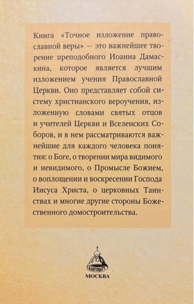 The book of St. John of Damascus is a unique work that makes a wonderful gift for any Orthodox Christian. This renowned theologian and apologist, who lived in the eighth century AD, left behind a significant patristic legacy that continues to inspire many. In his extensive work, John of Damascus laid out the fundamentals of dogmatics and the Orthodox Church's doctrine of God, the Holy Trinity, the days of creation, the Savior, the resurrection of the dead, icons, and much more. Published by Blagovest, this book features a beautiful hardcover, making it not only a valuable source of spiritual literature but also an excellent gift for Easter, Christmas, or Epiphany. It will be a worthy addition to any personal library, especially for those interested in Orthodox literature and church history. This spiritual legacy, which helps to deepen the understanding of the foundations of the Orthodox faith, is treasured and studied to this day. Give this book to yourself or a loved one to tap into the wisdom and spiritual depth offered by Orthodox literature.