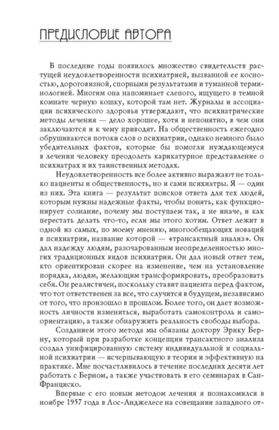 The first monograph on transactional analysis, it has become a classic text and the primary source for this field. The book contains Eric Berne's entire coherent theory, not only its core components developed in subsequent publications—game and scenario analysis—but also aspects not covered in the author's other books. Therefore, specialists primarily turn to this text, which is revolutionary in many respects and was not immediately appreciated by professional psychologists.