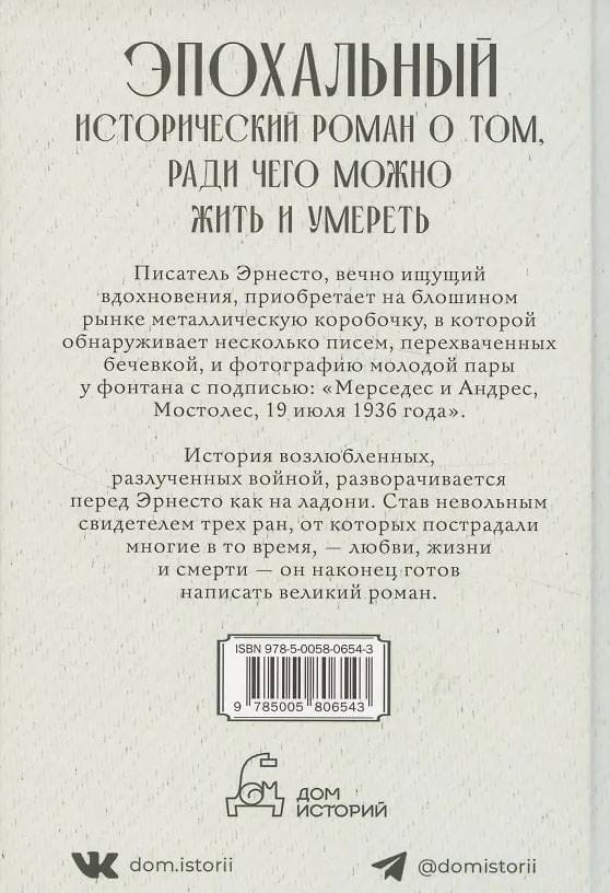 Writer Ernesto, always in search of inspiration, buys a metal box at a flea market, inside which is a photograph of a young couple at a fountain with the inscription: Mercedes and Andrés, Móstoles, July 19, 1936, and several letters tied with twine.