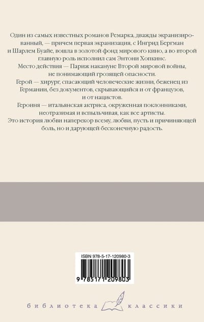 One of Remarque's most famous novels, twice screened - and the first adaptation, with Ingrid Bergman and Charles Boyer, entered the golden fund of world cinema, and the second starring Anthony Hopkins himself. The place of action - Paris on the eve of World War II, not realizing the impending danger. The hero is a surgeon, saving human lives, a refugee from Germany, without documents, hiding from both the French and the Nazis. The heroine is an Italian actress, surrounded by admirers, irresistible and fiery like all artists. This is a story of love against all odds, a love that hurts but also gives endless joy.