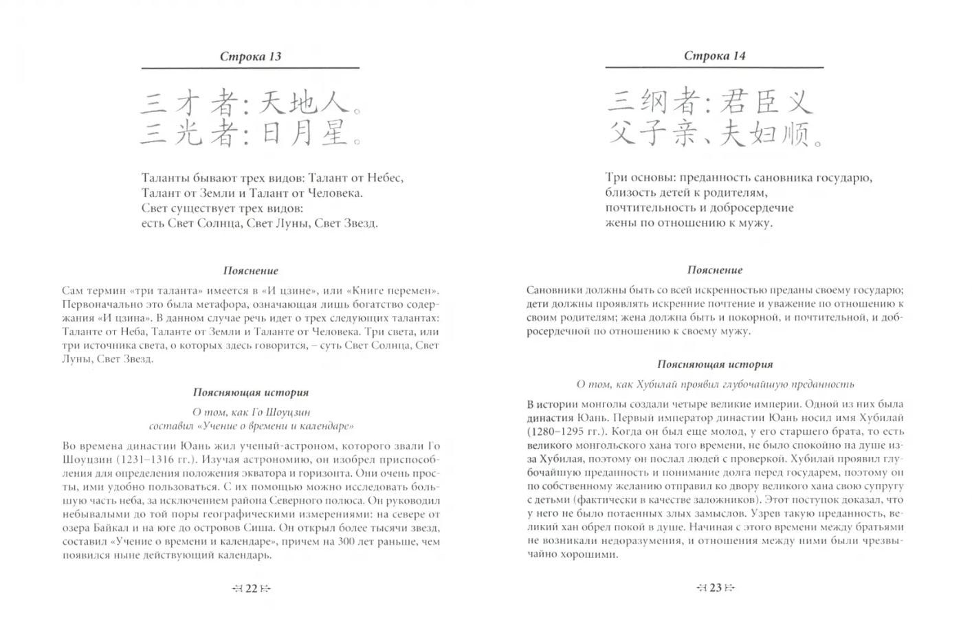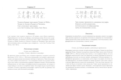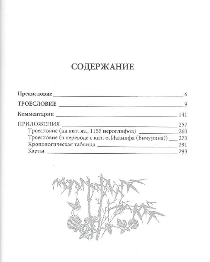 This is a neo-Confucian propaedeutic work of encyclopedic content, created in the form of a classical canon (jing), a "Chinese primer" - according to A. L. Leontiev, a "short children's encyclopedia" - according to N. Ya. Bichurin. It was the first book taught at school, it was memorized first of all, even before turning to other texts of the "Sextateuch" ("San bai qian") - the first educational book for every Chinese child. The appendices include: a poetic translation of the "Three Literatures" by Fr. Iakinf (Bichurin), published by him in 1829, and tables with the calligraphic Chinese text of the "Three Literatures" (1155 hieroglyphs - the classic version), and a chronological table and maps illustrating Chinese history.