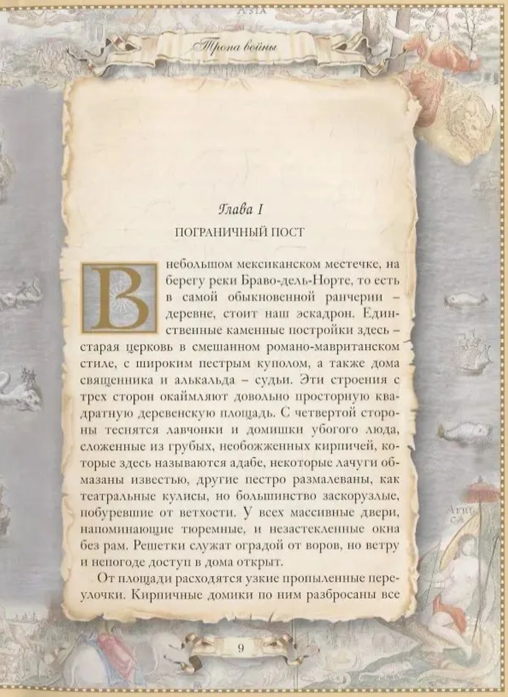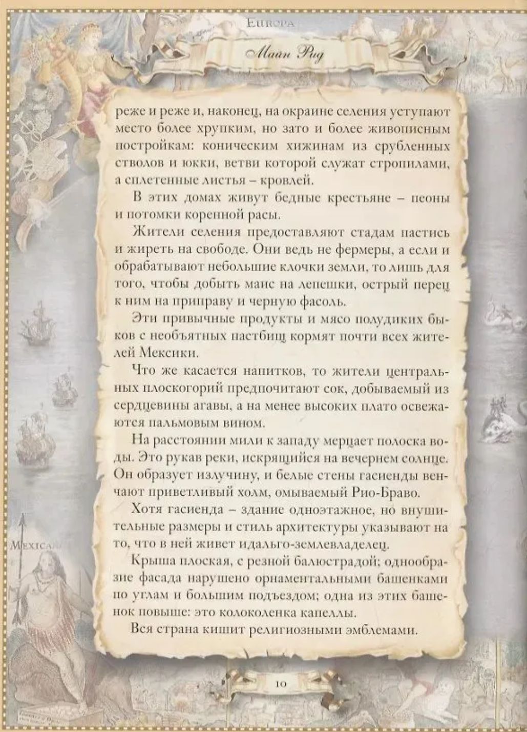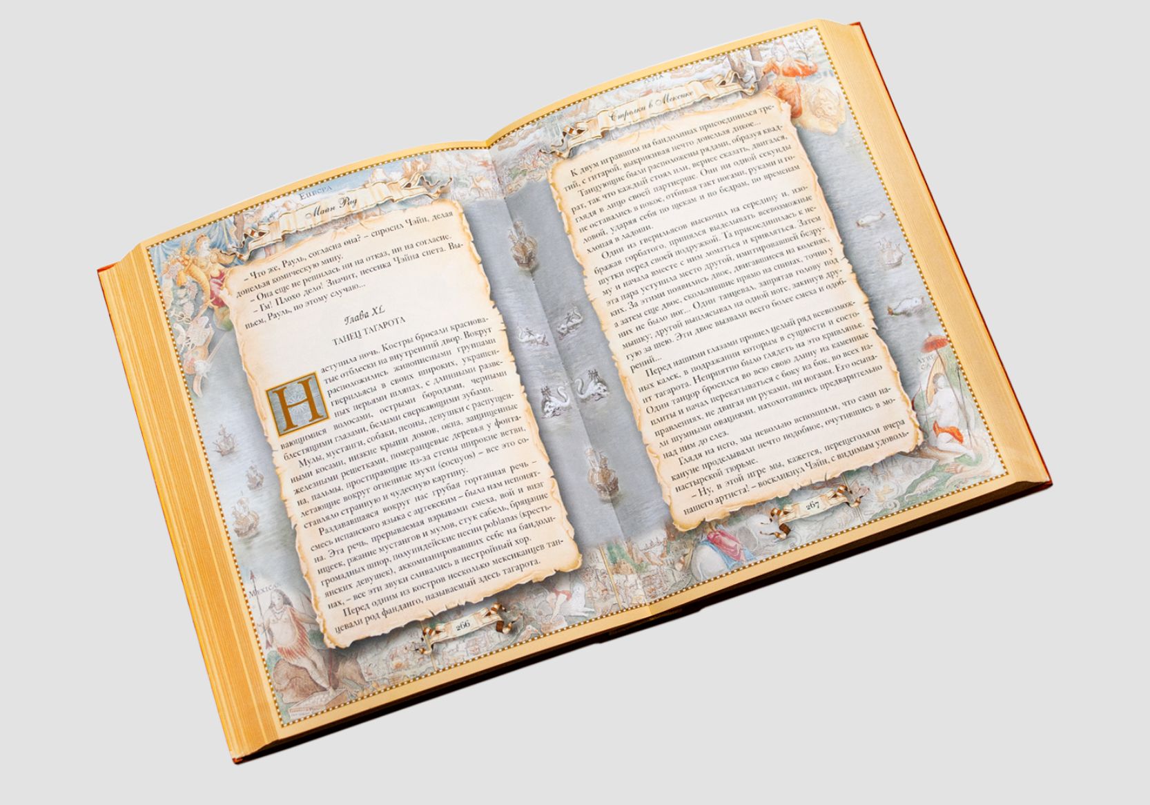 This book will be a true gem for any library, even the most exquisite. Its three-sided gilt edge, luxurious classic binding embellished with gold and silver foil, silk ribbon bookmark, thoughtful format, and color illustrations by ancient foreign and contemporary Russian artists will ensure that this edition finds a worthy place in the collection of anyone who appreciates books created with high artistic taste and craftsmanship. Decorated with gold and featuring an original backing in the form of an antique map, the pages, reminiscent of old scrolls, complete the design and create a special atmosphere for the books.