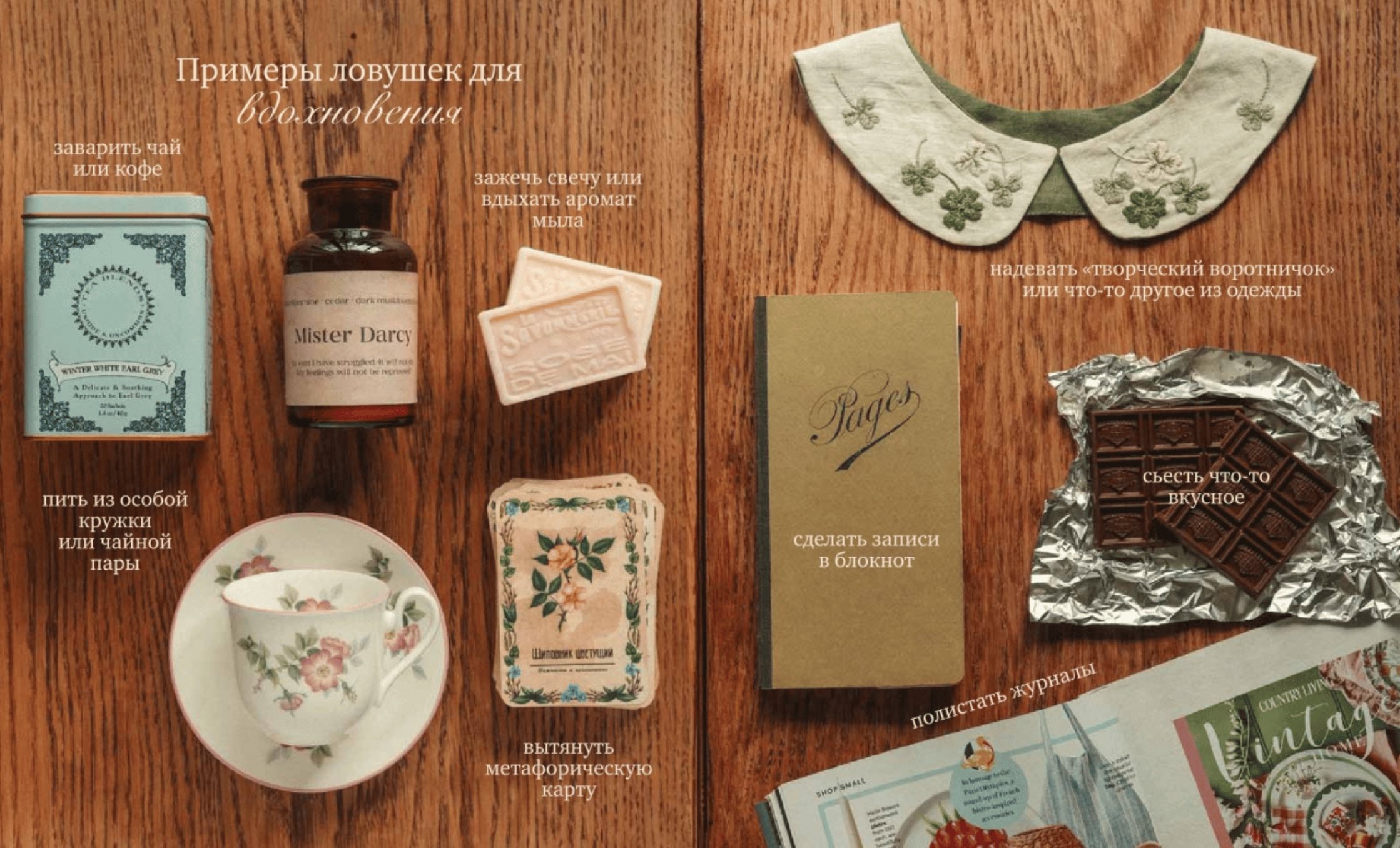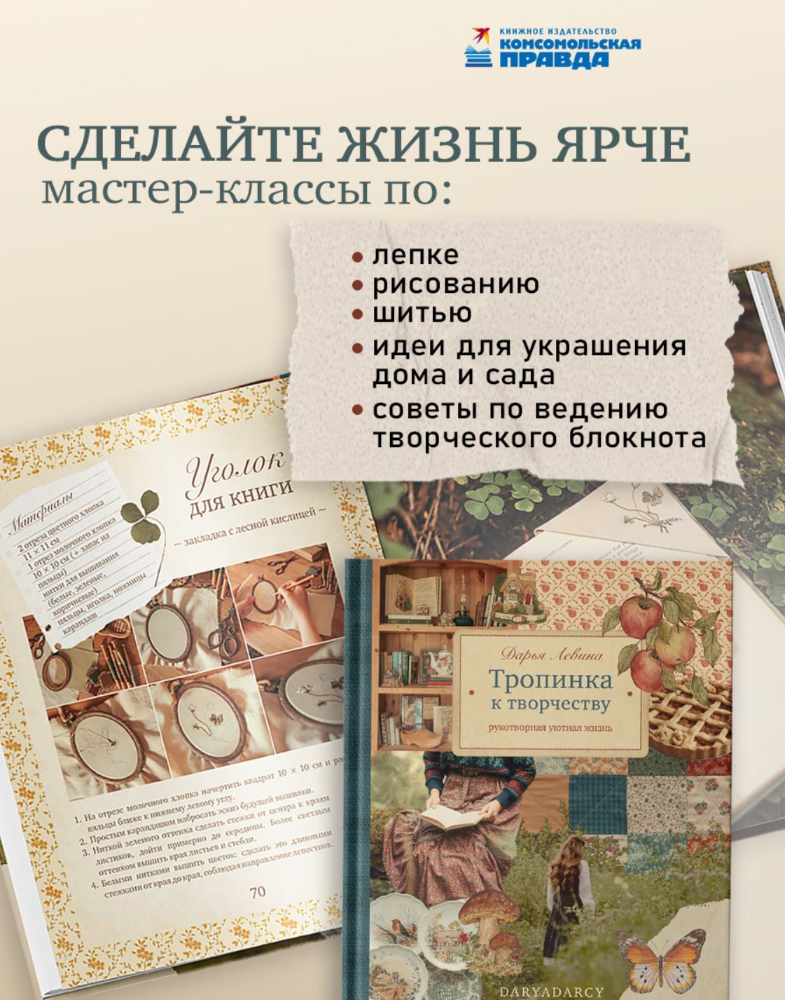 The new book by Daria Levina, a trendsetter in cottagecore style and author of the bestsellers "The Book of Inspiration" and "The Romance of the Dacha," brings together everything that makes life more vibrant: master classes in sculpting, drawing, sewing, and embroidery, ideas for decorating your home and garden, and even tips for keeping a creative notebook. Drawing on her own experience, Daria demonstrates that creativity can be not only a passion but also an inner strength. You'll find reflections on how to find inspiration and develop talent, how to cope with criticism and creative crises, and how to combine a hobby with motherhood and everyday concerns. And small creative rituals will help you gain self-confidence step by step. A special treat are favorite seasonal recipes: shepherd's stew, rhubarb crumble, pumpkin pie, winter cookies, and many more delicacies.